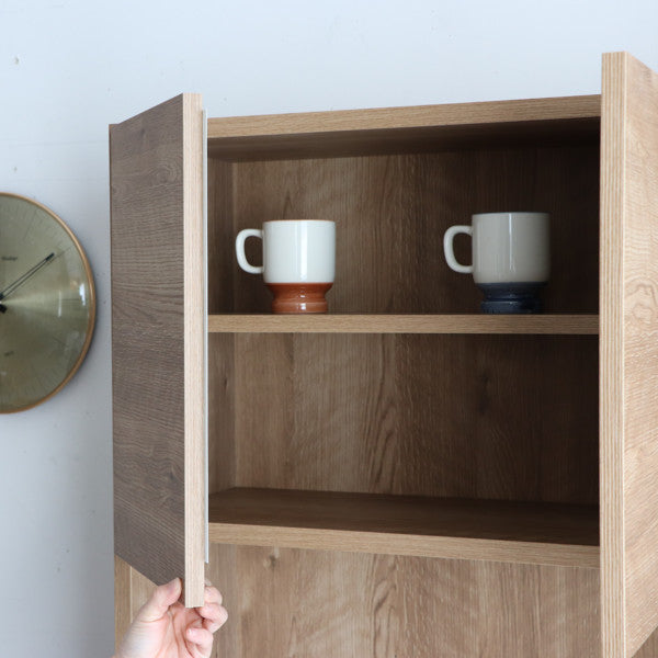 ウッド扉内にはそれぞれ大1枚、小1枚の計2枚の可動棚付きです。6cmピッチで3段階調節ができます。収納物に合わせて高さを調節でき、無駄なく収納していただけます。