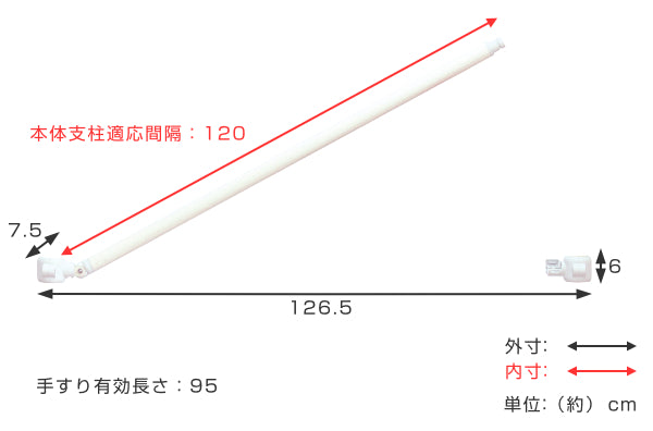 | サイズ | 約 幅126.5×奥行7.5×高さ6(cm) 本体支柱適応間隔:120(cm) 手すり有効長さ:95(cm) |