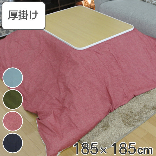 185×185cmの正方形タイプのこたつ布団です。表生地と裏生地は綿100%仕様です。とても肌触りが良く、冬場に困りがちな静電気が発生しにくいため快適にお過ごしいただけます。