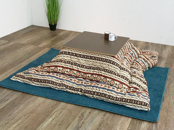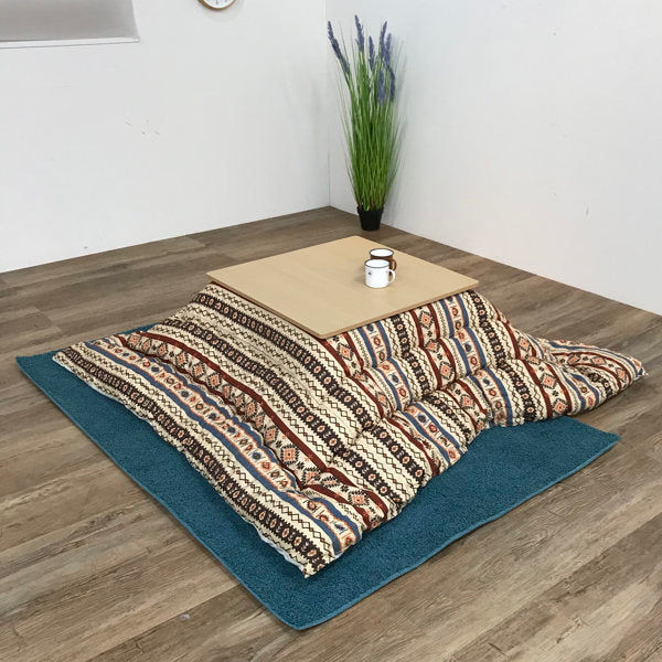 存在感抜群でインテリアに映えるキリム調ラパス柄のこたつ布団です。キリムとは遊牧民が家族の幸せを願う気持ちを込めた模様で、その色づかいからも優しいぬくもりが感じられるデザインです。