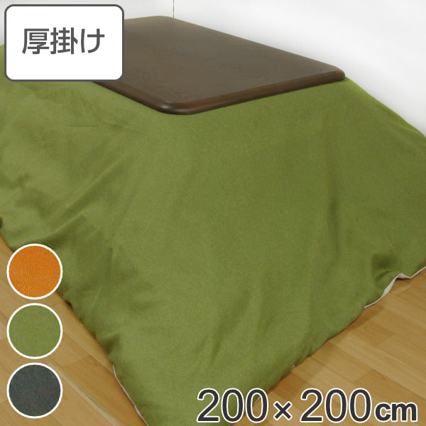 200×200cmの正方形タイプのこたつ布団です。素材にこだわっており、表生地は撥水加工を施したポリエステル100%、裏生地は綿100%仕様です。肌触りが良く、冬場に困りがちな静電気が発生しにくいため快適にお過ごしいただけます。