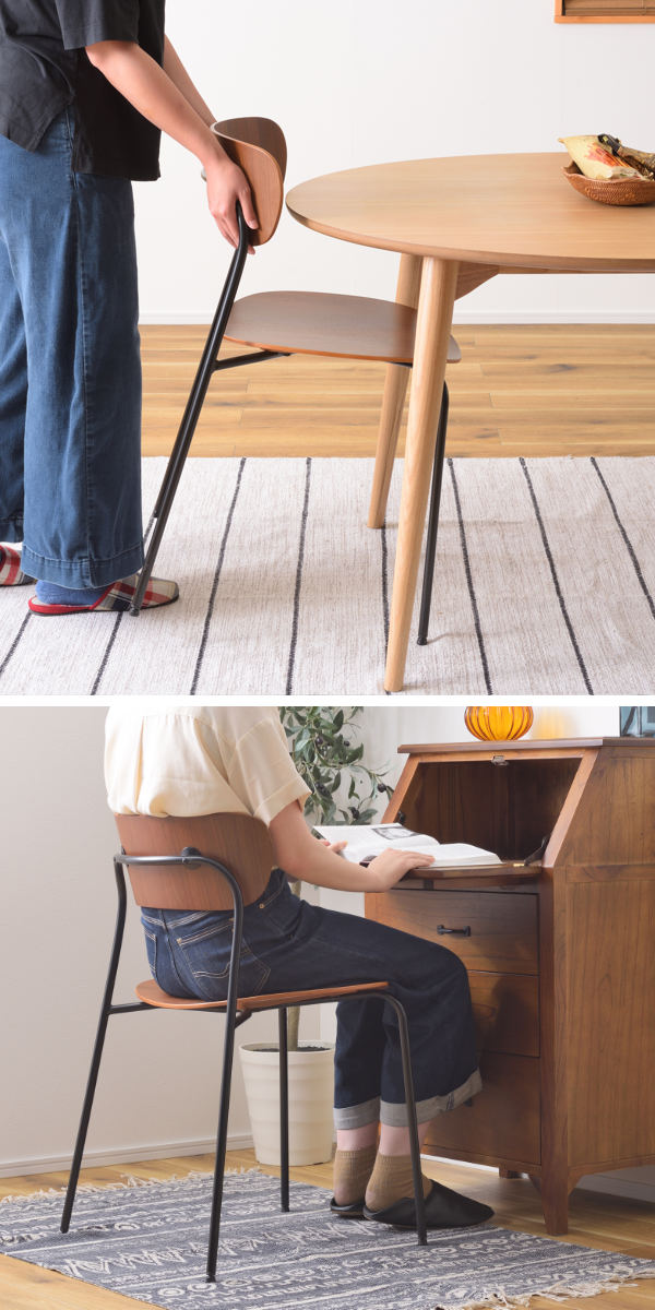 1脚あたり約4kgと軽量設計なので簡単に持ちあげて移動ができます。普段はダイニングチェアとして使い、在宅ワークやパソコンデスク、BBQにデッキやベランダへ運んで使うこともできます。