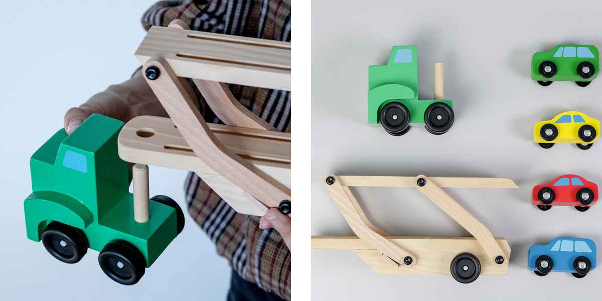 手に持ったサイズ感 車は小さなお子さまでも握りやすいサイズです。車を積んだトラックは大きくて木の重厚感がありますが、滑りやすいタイヤでお子さまでもスムーズに動かすことができます。 |