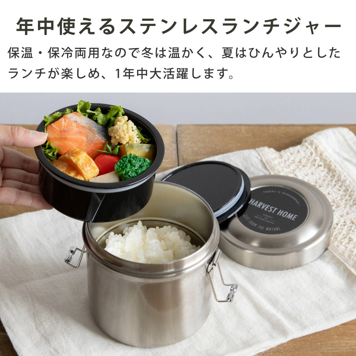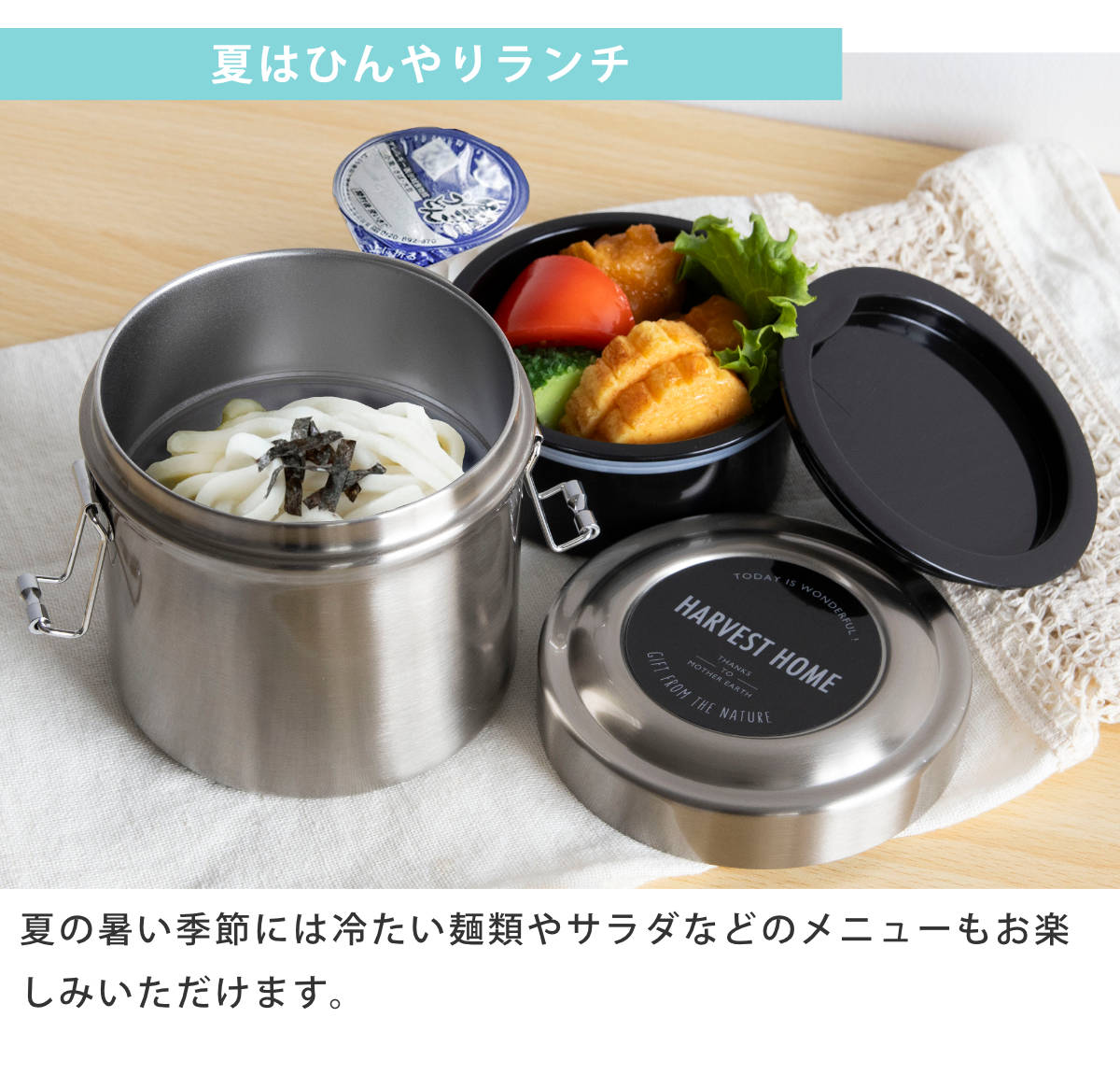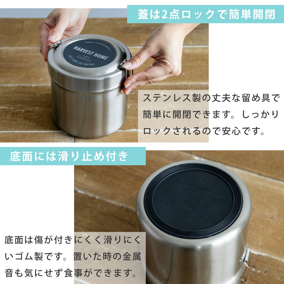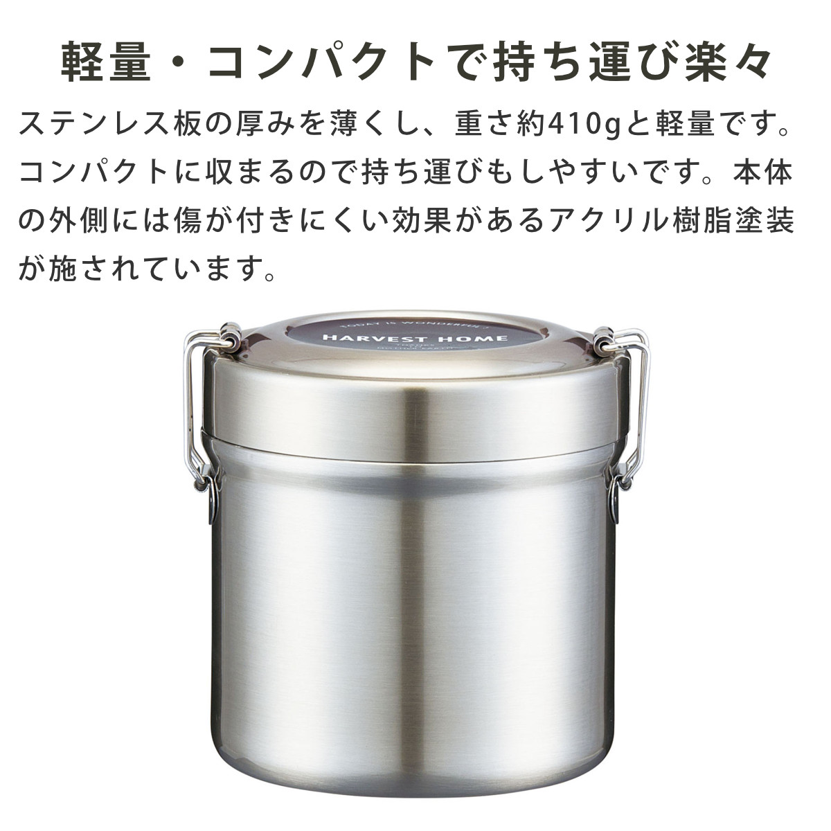 | 材質 | 中容器・中蓋:ポリプロピレン パッキン:シリコーン 底板:エラストマー 本体・蓋:ステンレス鋼(アクリル樹脂塗装) 留め具:ステンレス |