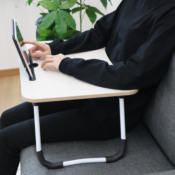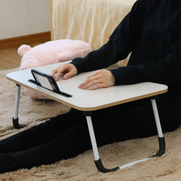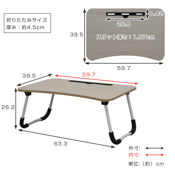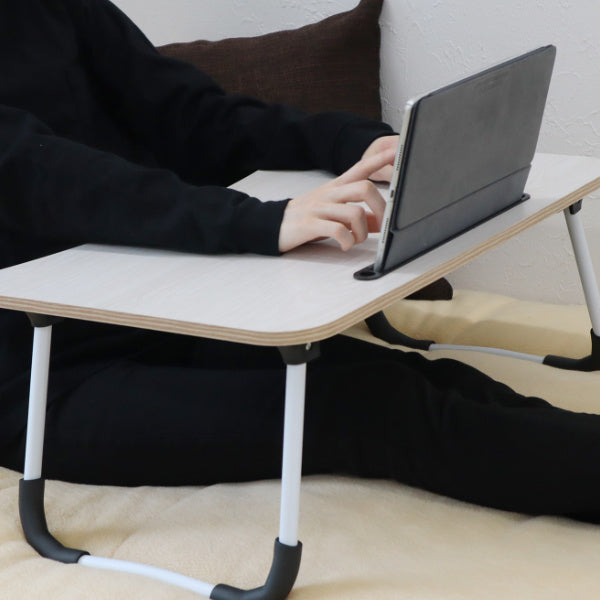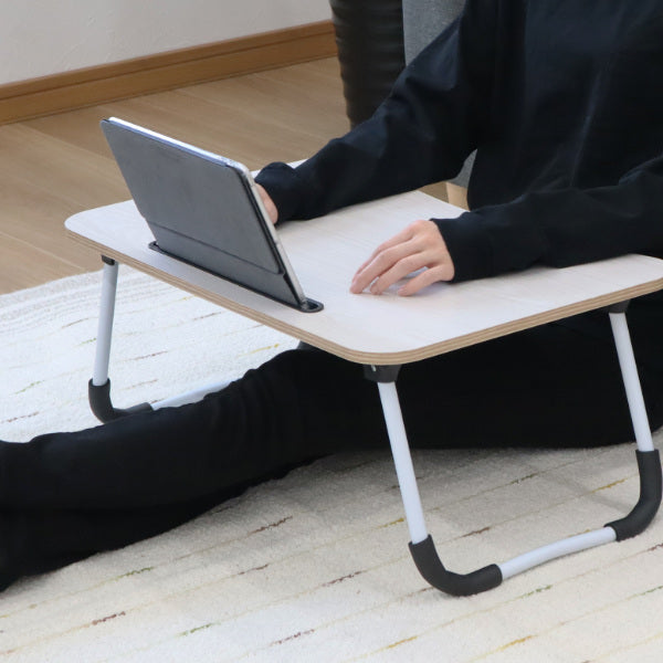 テーブル天板にスリットが付いていて、スマートフォンやタブレットを差し込めるので、大人だけでなくお子様にもおすすめです。テレワークやちょっとした書き物にも便利です。軽く折りたたむことができるので、手軽に持ち運んでベッドや床などどんな場所でもお使いいただけます。