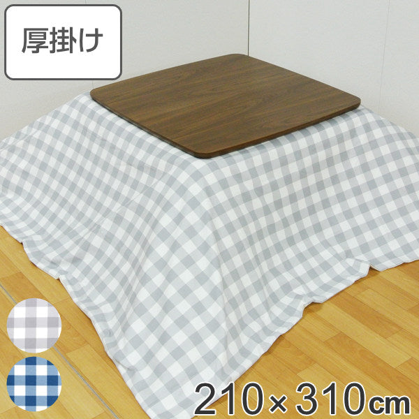 210×310cmの長方形タイプのこたつ布団です。表生地と裏生地は綿100%仕様です。とても肌触りが良く、冬場に困りがちな静電気が発生しにくいため快適にお過ごしいただけます。