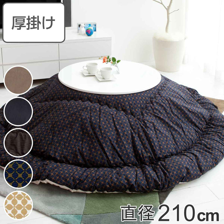 直径210cmの円形タイプのこたつ布団です。表生地も裏生地も綿100%仕様の日本製こたつ布団です。冬場に困りがちな静電気が発生しにくいため快適にお過ごしいただけます。