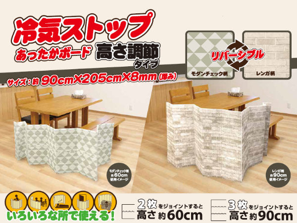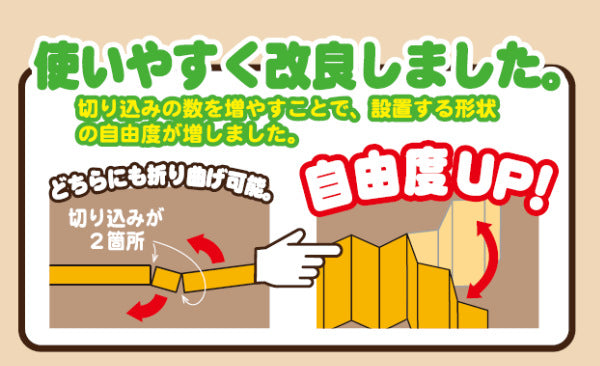 置く場所によって簡単に高さを変える事ができます。2枚をジョイントすると高さは約60cm、3枚をジョイントすると高さは約90cmになります。またボードが長すぎると感じる場合は、必要な長さにカットして調節できます。