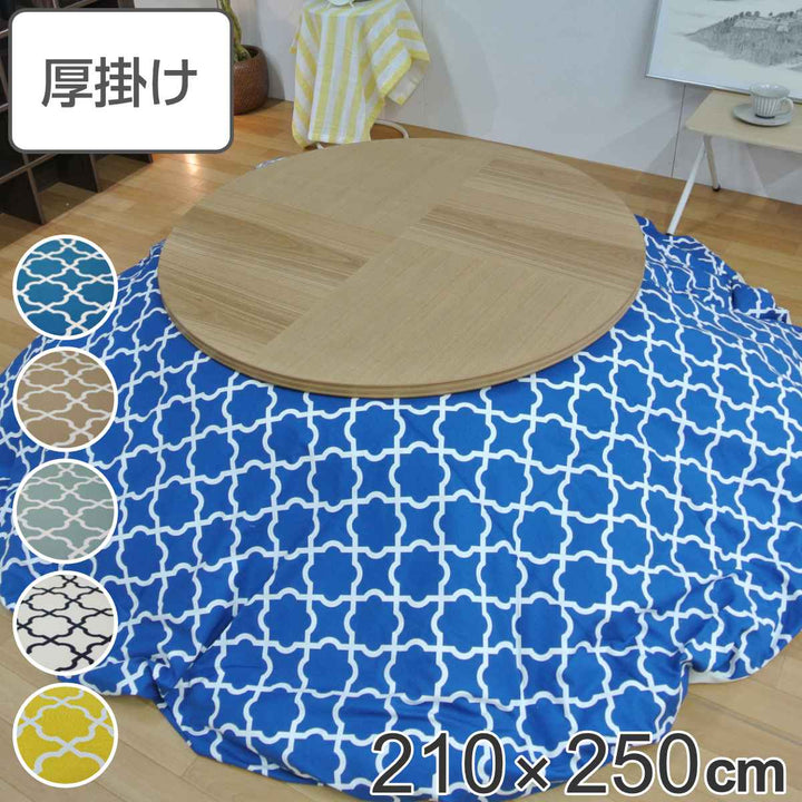 210×250cmの楕円形タイプのこたつ布団です。表生地と裏生地は綿100%仕様です。とても肌触りが良く、冬場に困りがちな静電気が発生しにくいため快適にお過ごしいただけます。