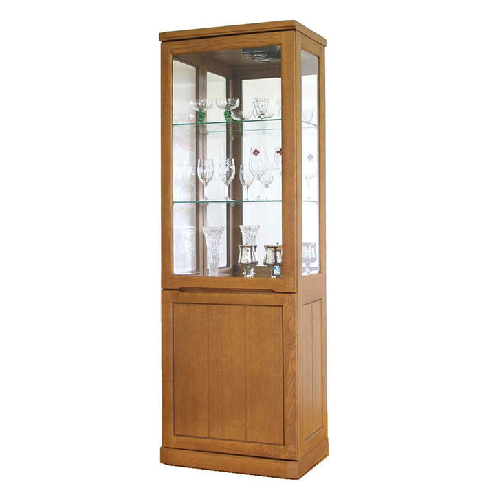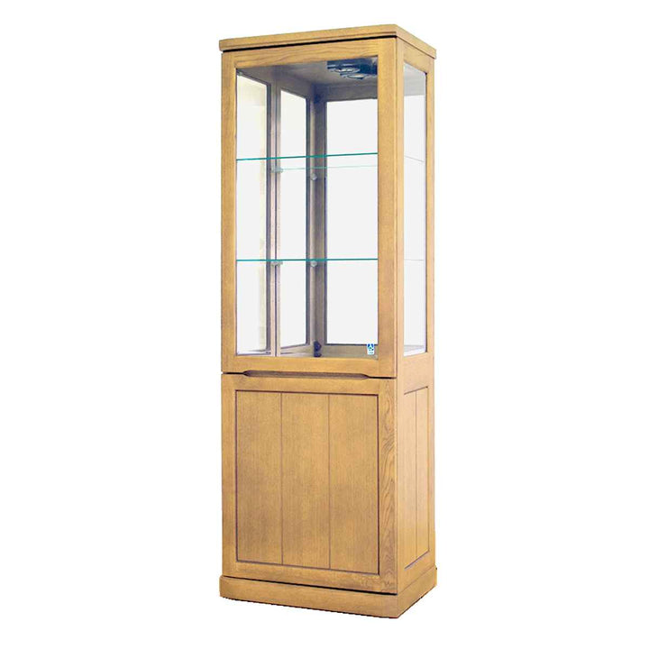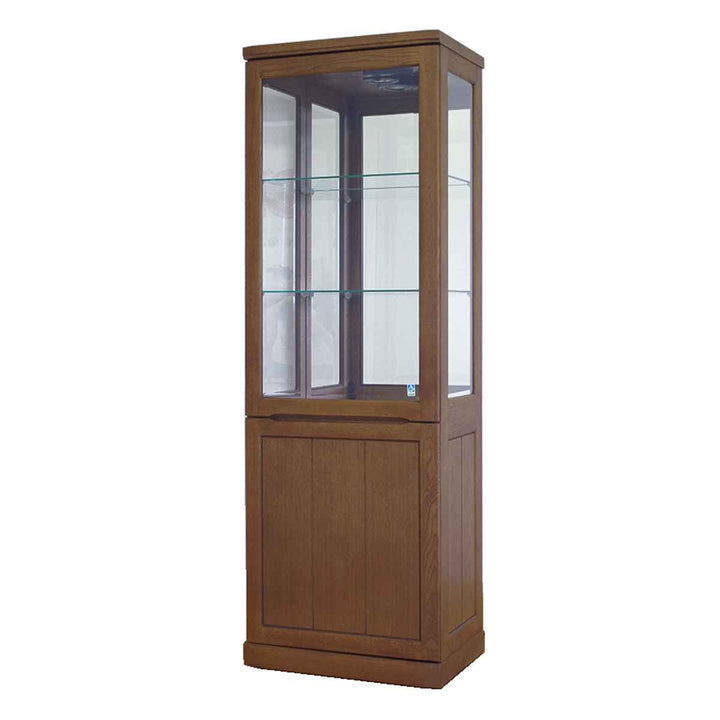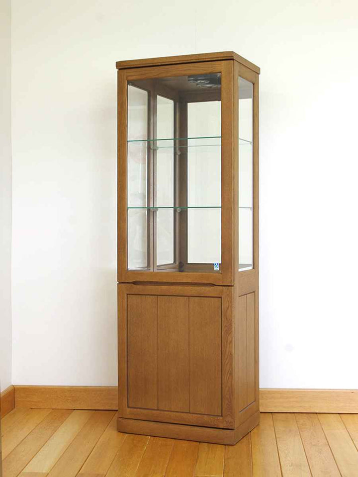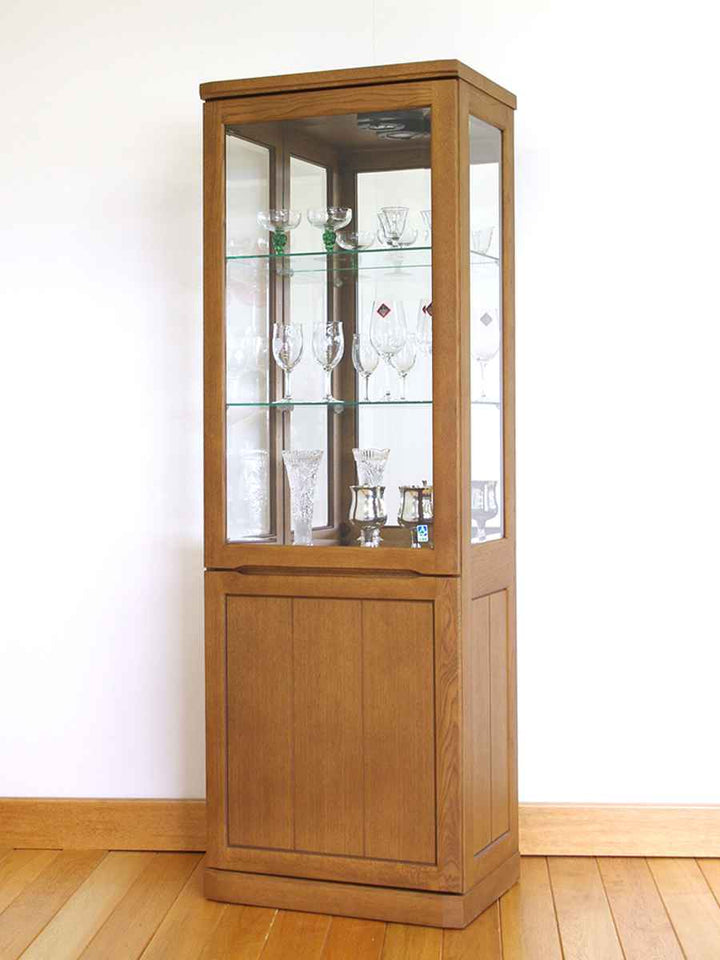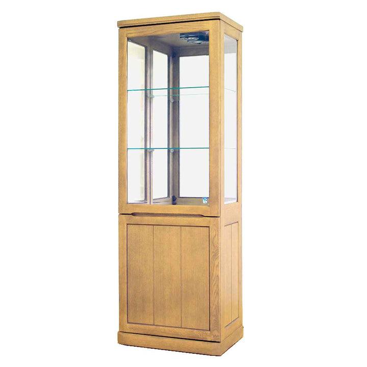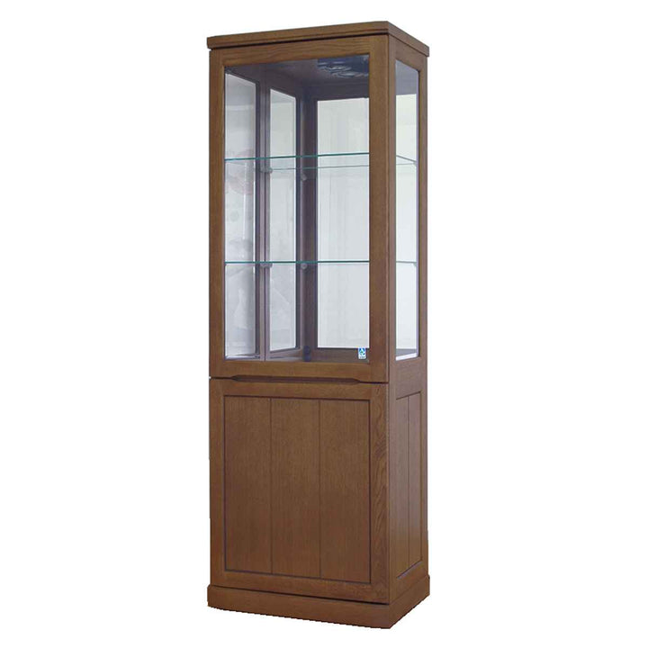 フロントがすっきりとしたシンプルなデザインで置き場所を選びません。艶の無いマットな総仕上げで天然木の質感を引き立てます。上段でディスプレイ、下段にも収納スペースがあるので、見せる収納と隠す収納で使い分けができます。