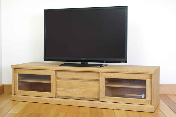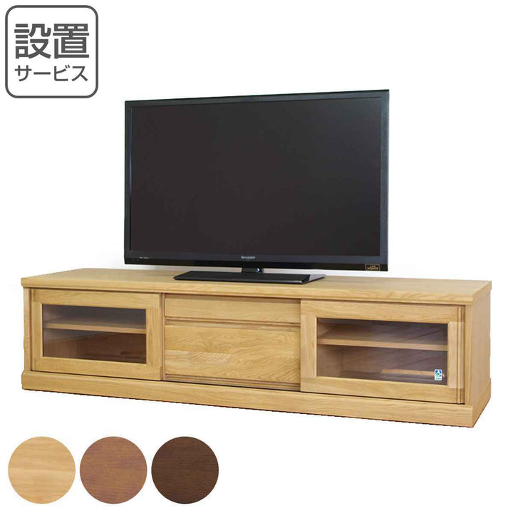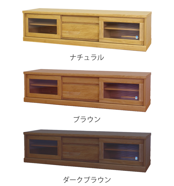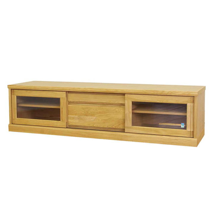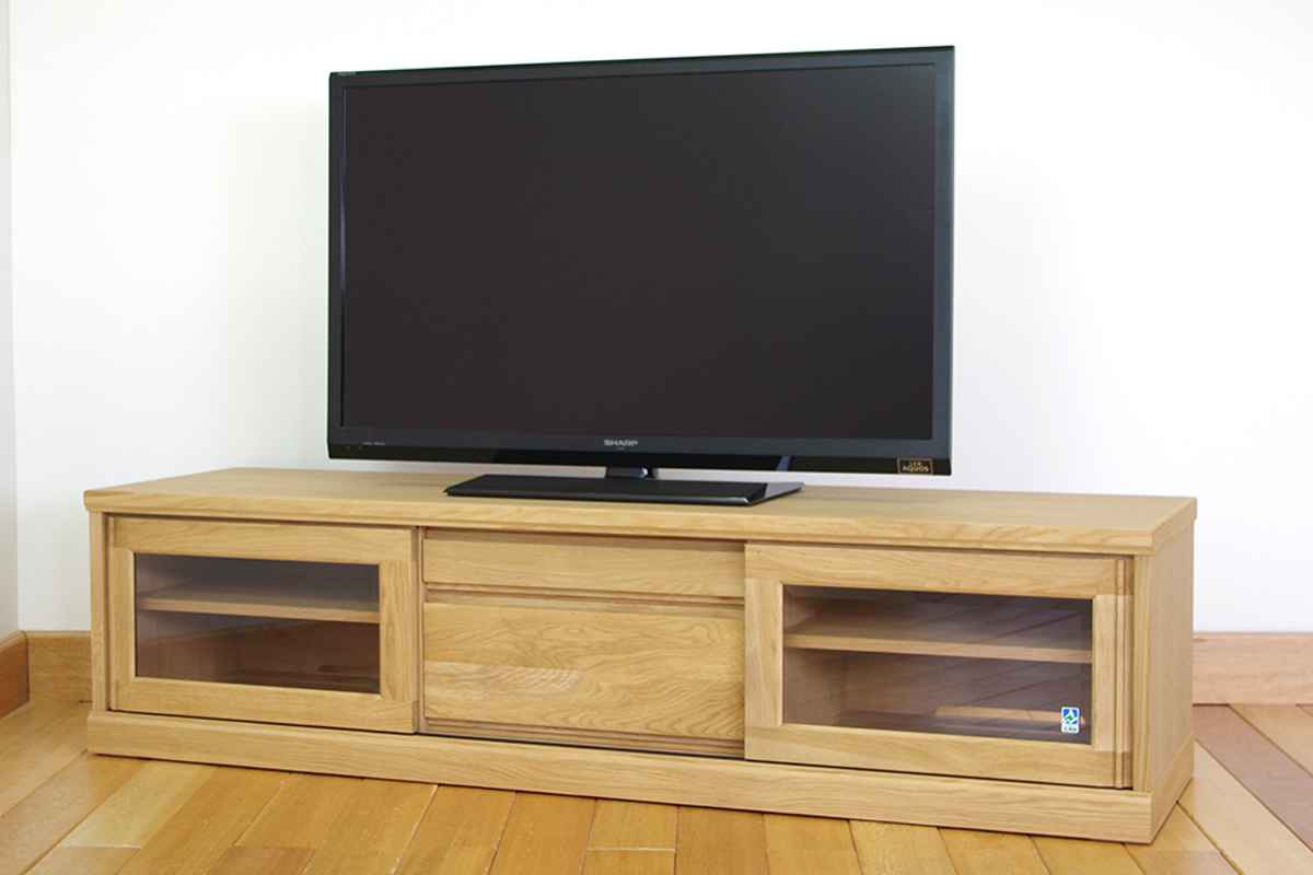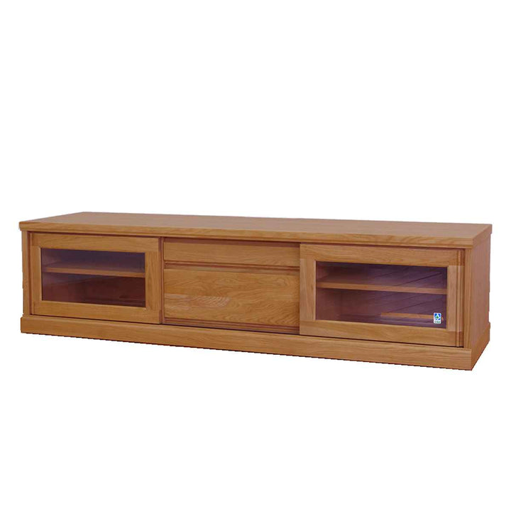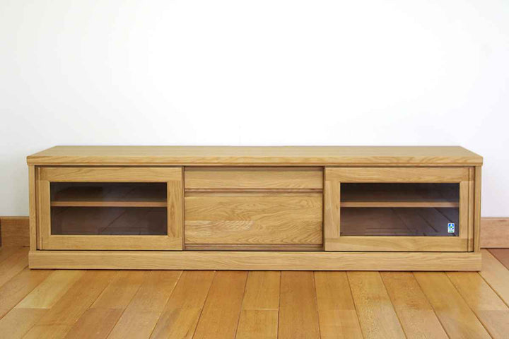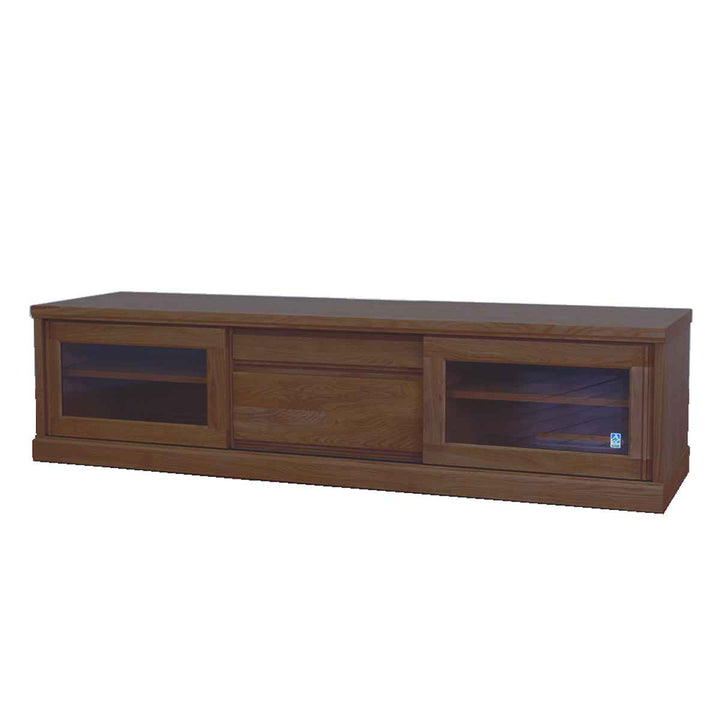 フロントがすっきりとしたシンプルなデザインで置き場所を選びません。艶の無いマットな総仕上げで天然木の質感を引き立てます。左右に引き戸、中央には引出しが1杯付いているので小物やAV機器の収納もしっかりできます。