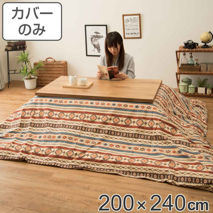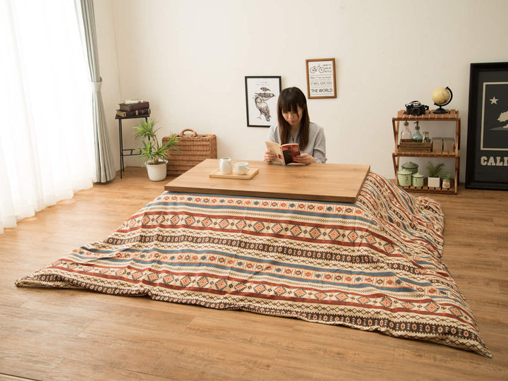 存在感抜群でインテリアに映えるキリム調ラパス柄のこたつ布団です。キリムとは遊牧民が家族の幸せを願う気持ちを込めた模様で、その色づかいからも優しいぬくもりが感じられるデザインです。