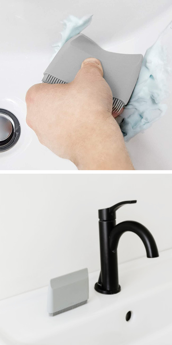 シリコン製で柔軟性があるので使いやすく、浴室やキッチンシンクなどの細かい曲面を簡単に洗浄できます。薄くて軽量なので立てかけておけば収納にも困りません。