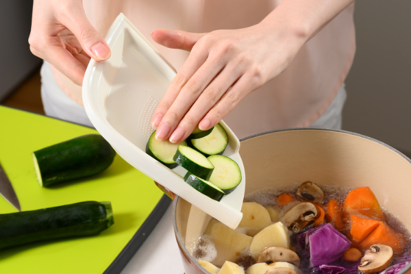 刻んだ食材をまな板の一角のパレット部分に集めてまな板から取り外すと、鍋やフライパンに入れる際にスムーズに移すことができます。