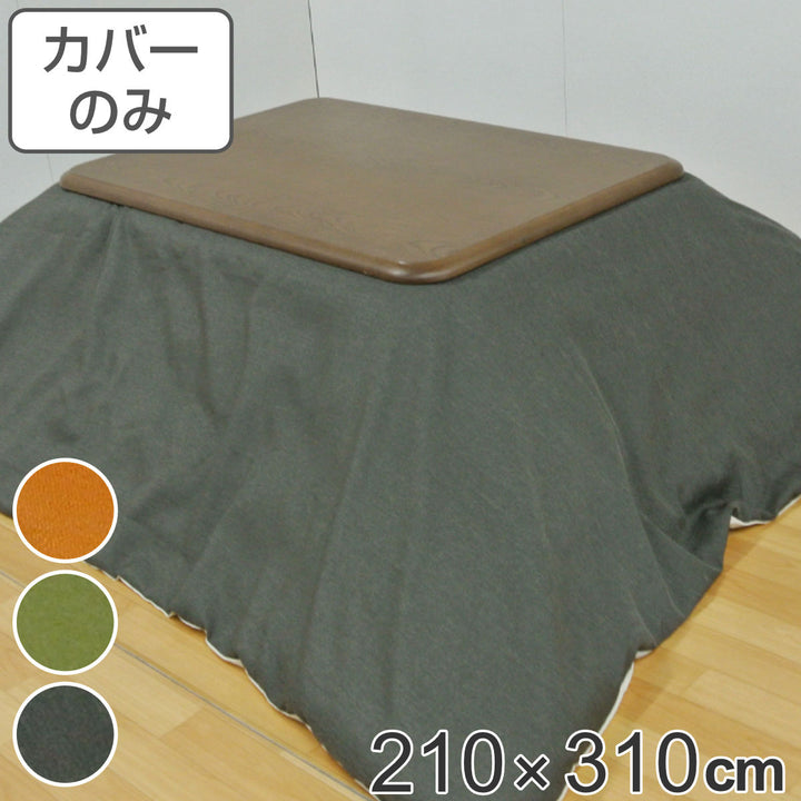 210×310cmの長方形タイプの日本製こたつ布団カバーです。素材にこだわっており、表生地は撥水加工を施したポリエステル100%、裏生地は綿100%仕様です。肌触りが良く、冬場に困りがちな静電気が発生しにくいため快適にお過ごしいただけます。