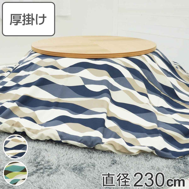 直径230cmの円形タイプのこたつ布団です。表生地と裏生地は綿100%仕様です。とても肌触りが良く、冬場に困りがちな静電気が発生しにくいため快適にお過ごしいただけます。