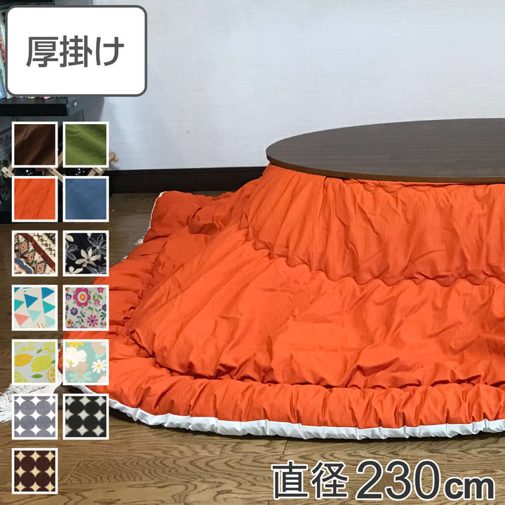 直径230cmの円形タイプのこたつ布団です。表生地と裏生地は綿100%仕様です。とても肌触りが良く、冬場に困りがちな静電気が発生しにくいため快適にお過ごしいただけます。