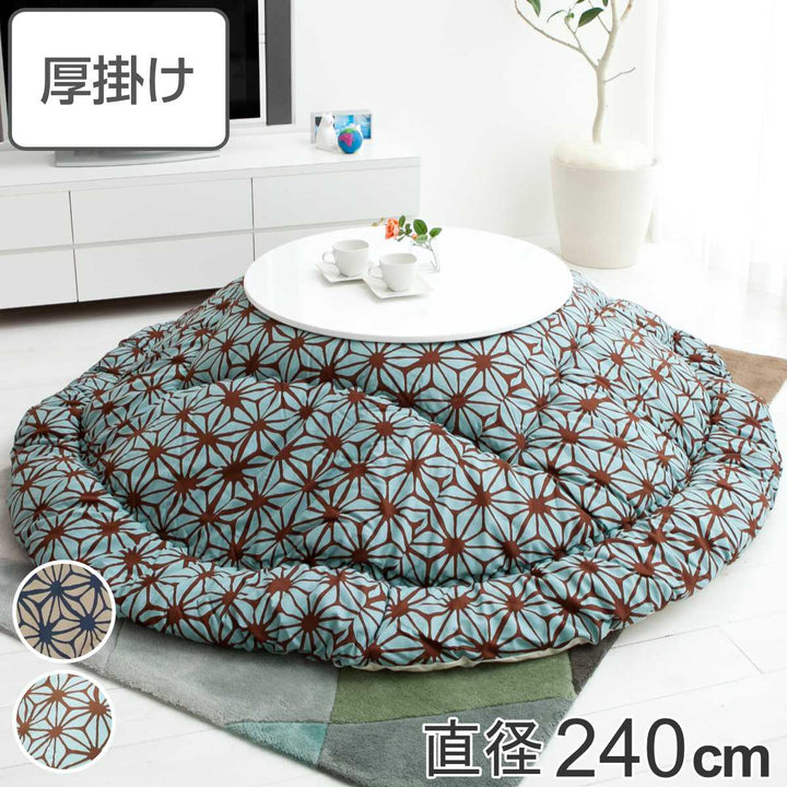 直径240cmの円形タイプのこたつ布団です。表生地と裏生地は綿100%仕様です。とても肌触りが良く、冬場に困りがちな静電気が発生しにくいため快適にお過ごしいただけます。