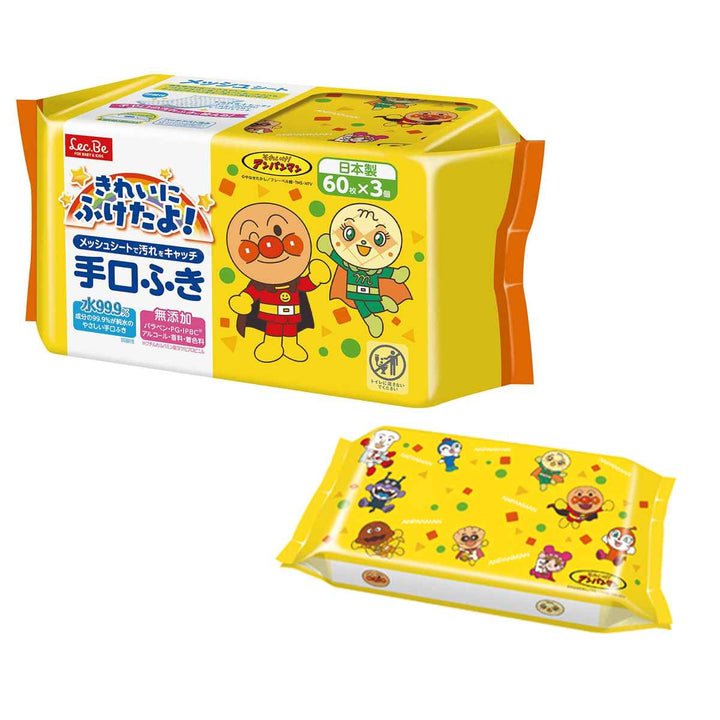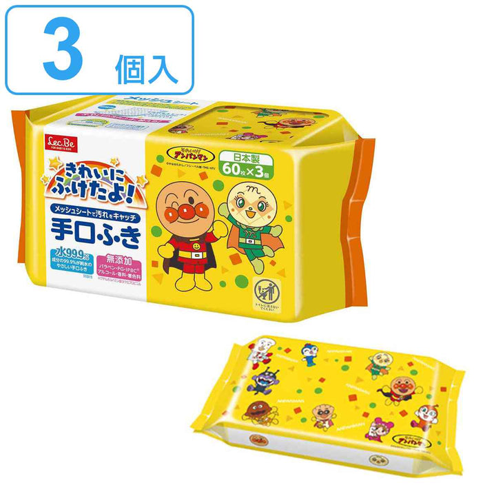 お子さまに大人気のアンパンマンがデザインされた手口ふき60枚×3個の180枚入りです。程よい水分量の柔らかいシートで汚れをすっきり落とすことができます。赤ちゃんの敏感なお肌にも優しく、肌触りがいいのも嬉しいポイントです。離乳食が始まった赤ちゃんや、ご飯を自分で食べるようになった小さなお子さまにピッタリです。