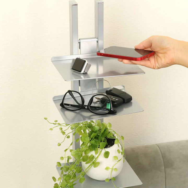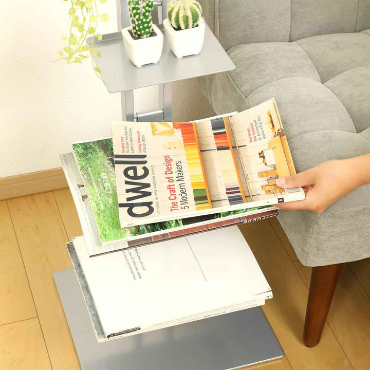 シンプルなデザインのスチール製タワーシェルフです。読みかけの本やCDをポンっとそのまま棚に積んでおくことができます。リビングやベッドサイドなどの省スペースでお使いいただけます。