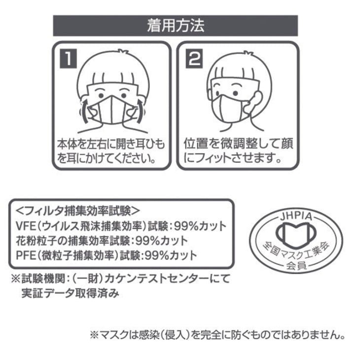 | 材質 | 表地:ポリエステル フィルタ:ポリプロピレン 裏地:ポリプロピレン 耳ひも部:ポリエステル・ポリウレタン |