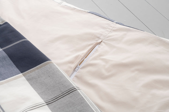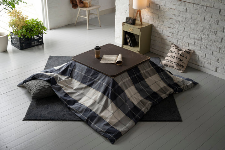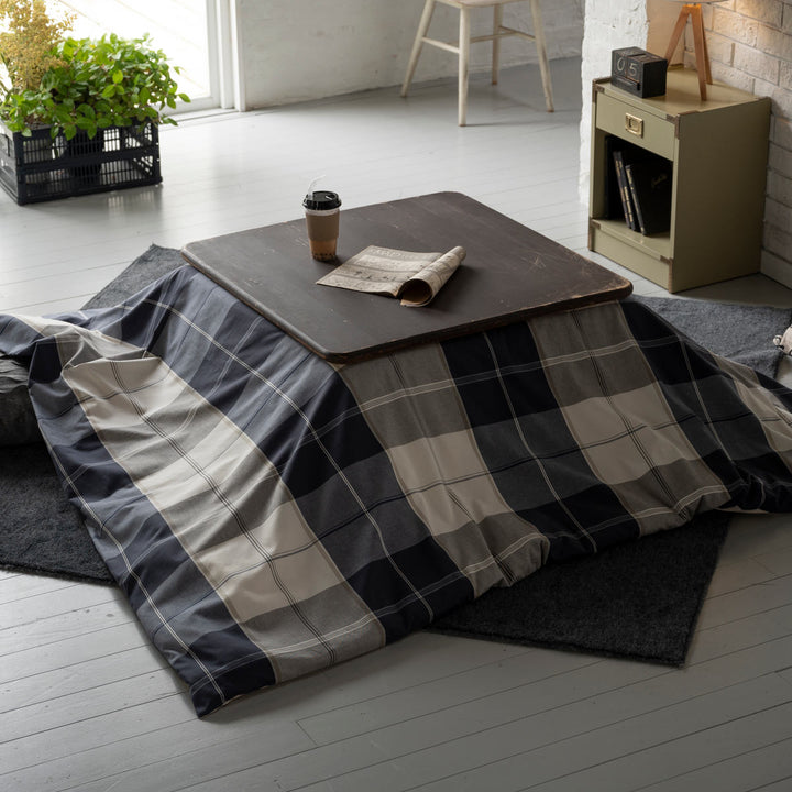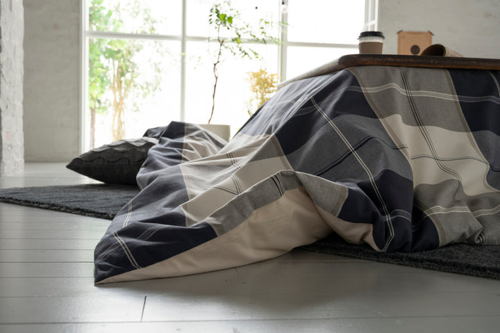 先染めの色糸で織り上げた綿100%の生地で、肌触りの良いこたつ布団カバーです。シックなネイビーのブロックチェックデザインがお部屋をモダンな印象に彩ります。