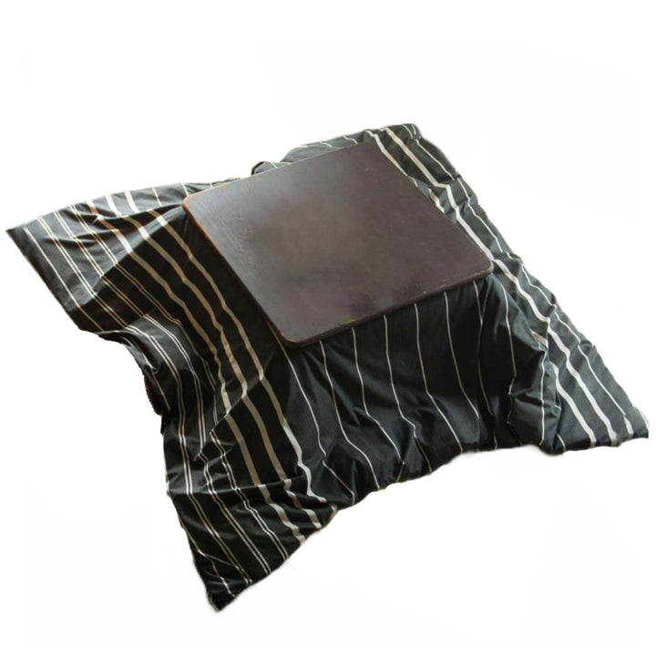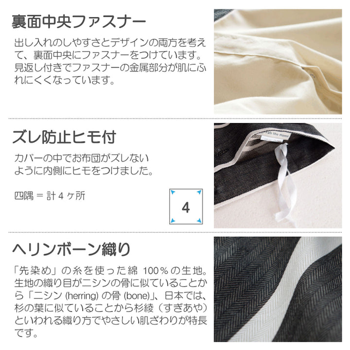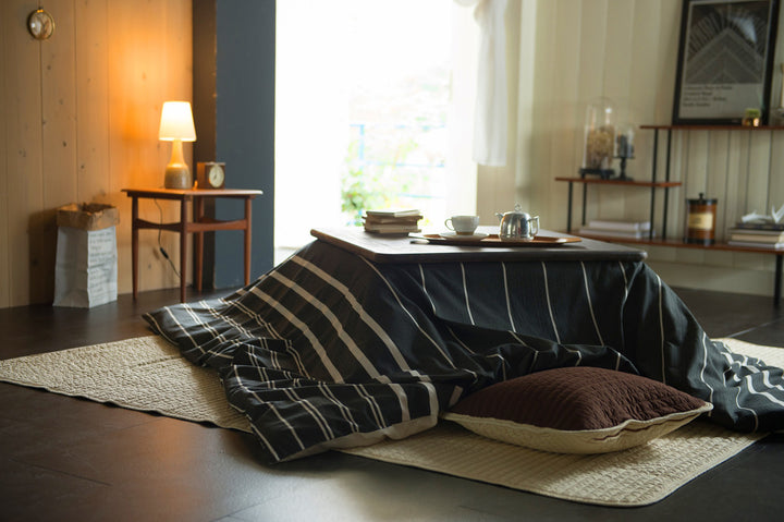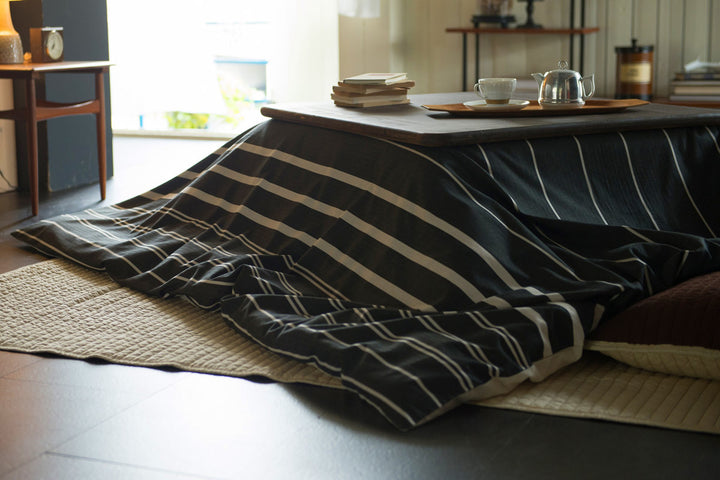 先染めの色糸で織り上げた綿100%の生地で、肌触りのいいこたつ布団カバーです。ゼブラウッドの木肌感をイメージしたチャコールのモノトーンボーダーが、落ち着きのある空間を演出してくれます。