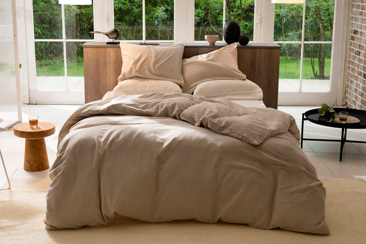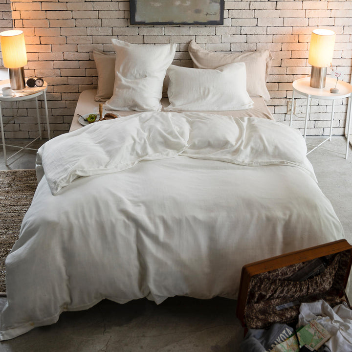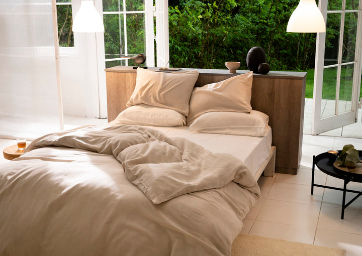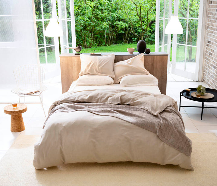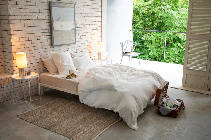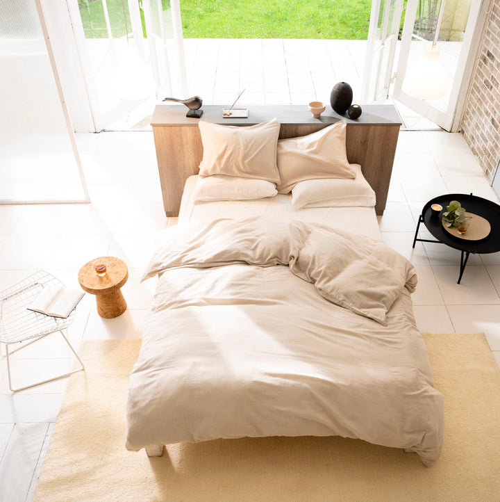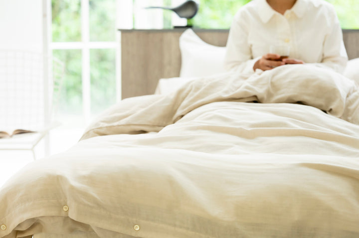 大きなサイズのベッドリネンは接ぎ目が入っていることが多いですが、Fab the Homeでは広い生地幅を生かし、肌に触れる部分に接ぎ目がない仕様に仕上げています。裾で留めるタイプなので、ファスナーやボタンが身体に当たるなどの不快感もなく、快適にお休みいただけます。