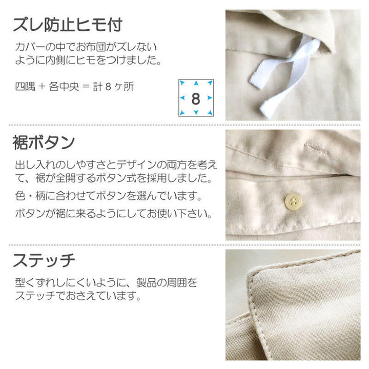 ズレ防止ヒモ付き カバーの中でお布団がズレないように、内側にヒモが付いております。(四隅+各中央 計8ヶ所) |