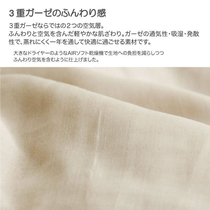 3重ガーゼならではの2つの空気層がふんわりと空気を含んだ軽やかな肌触りです。ガーゼの通気性・吸湿性・発散性で、蒸れにくく1年を通して快適にお過ごしいただけます。