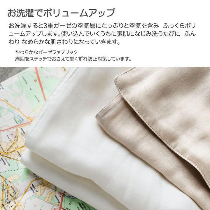 お洗濯すると3重ガーゼの空気層にたっぷりと空気を含み、ふっくらボリュームアップします。使い込んでいくうちに素肌になじみ、洗うたびにふんわりなめらかな肌触りになっていきます。