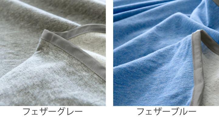 40番手のコーマ糸を32ゲージ(針)というハイゲージで編み上げることで、編み目が細かくふんわりやわらかで上品な風合いに仕上がっています。ニットケットの全周はグレーのファブリックで丁寧にパイピング仕上げされているので、生地ほつれせずに永くご使用いただけます。