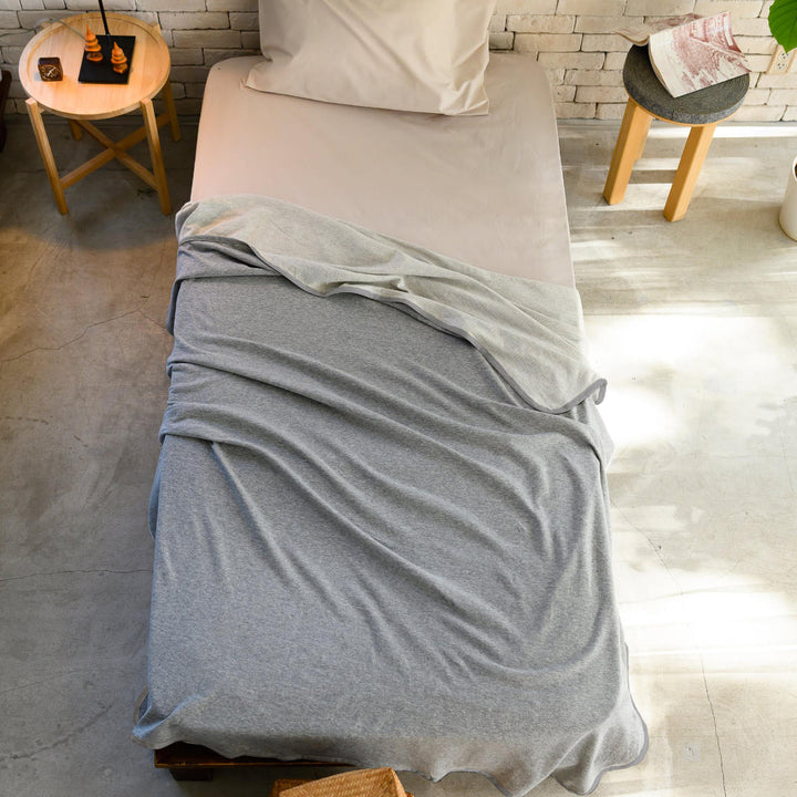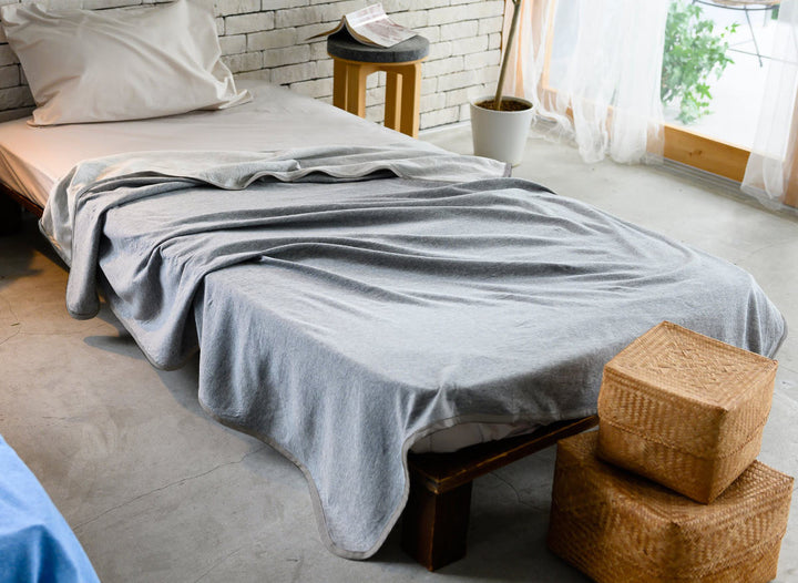 シンプルな平編みニットでつくられたニットケットは、杢糸を使用することで見た目にもやわらかな風合いに仕上げています。落ち着いたカラーのファブリックで、どんなタイプのお部屋でもしっくりなじみます。