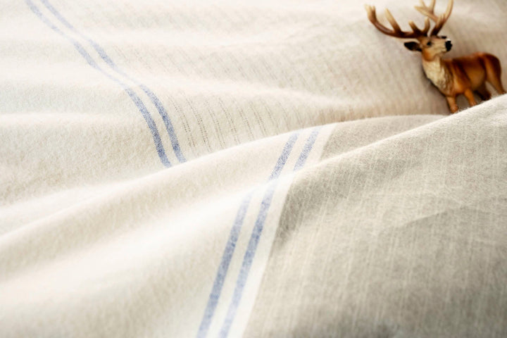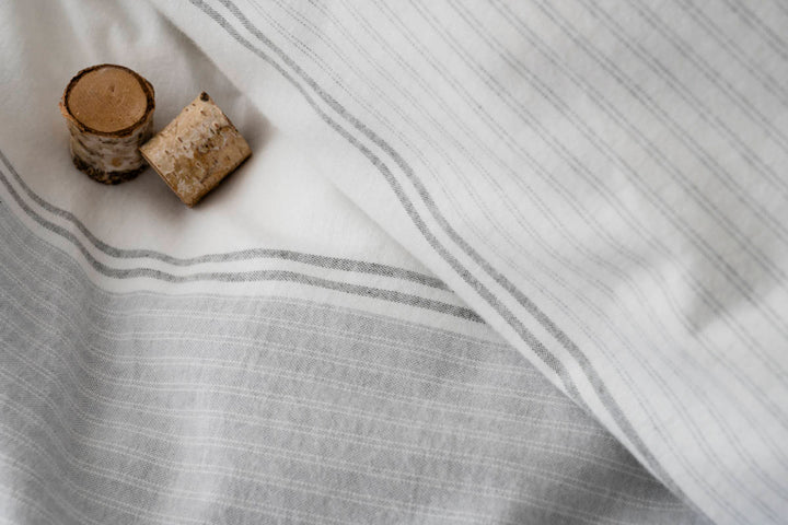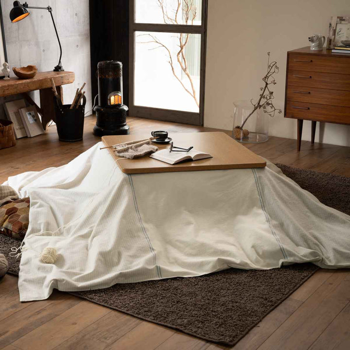 北欧の雪の街 レヴィ、雪に包まれた美しく澄んだ風景を連想する「レヴィ」シリーズのこたつ布団カバーです。シンプルな先染めファブリックをふんわりと起毛させたあたたかでしあわせな肌ざわりです。上品な色合いのボーダー生地が居心地の良い空間を演出してくれます。