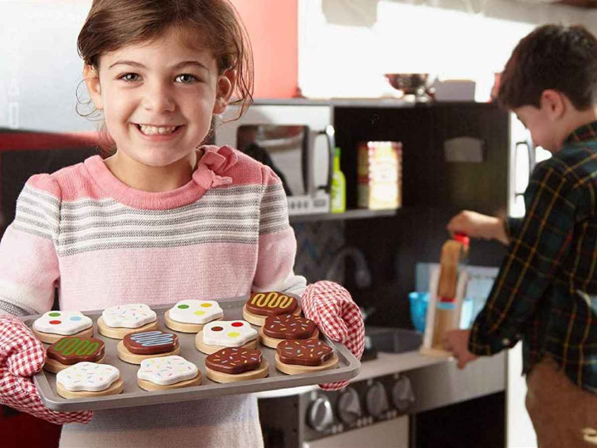 クッキー生地からミトンまで付属した本格的なクッキー作りができるおままごとセットです。大人のまねごとが大好きな子供たちはおままごとでたくさんのことを学んでいきます。こちらのセットでは、包丁でクッキー生地を切ったり、トッピングを選らんで焼いたりと、色々な体験をすることができ、お子さまの想像力を育んでくれます。また、お友達やご家族と一緒に遊ぶことで、コミュニケーション能力の向上にも繋がります。ギフトボックスに入っているので、お誕生日プレゼントにもおすすめです。
