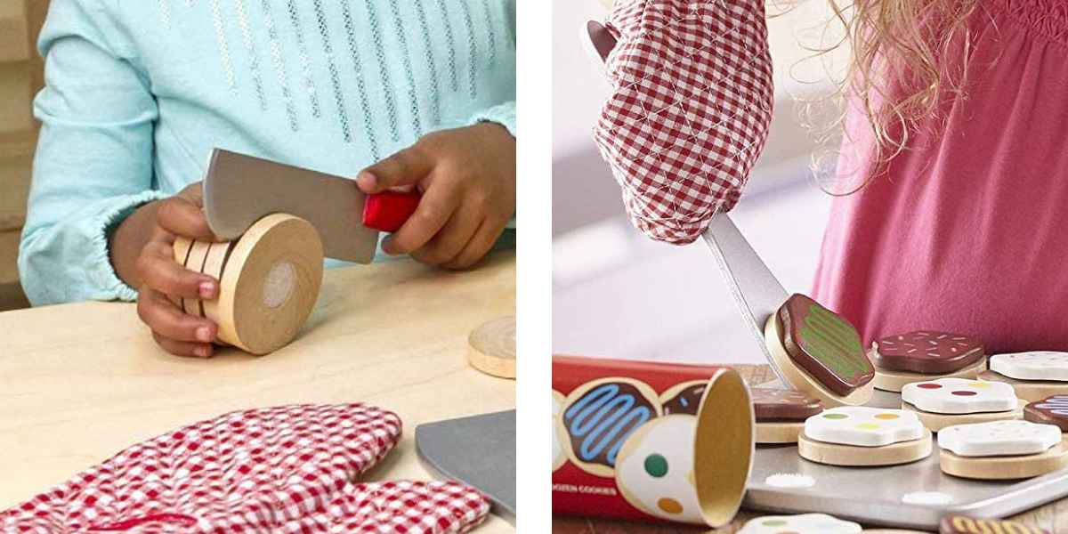 クッキー作りはクッキー生地を包丁で切り分けるところから始まります。包丁で食材を切ったり、手にミトンをはめてプレートをオーブンから出してみたり、スパチュラでクッキーを持ち上げて盛り付けたりと、おままごと遊びから道具の使い方を学ぶことができます。