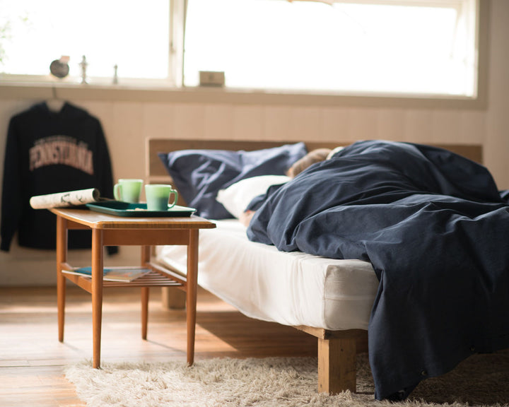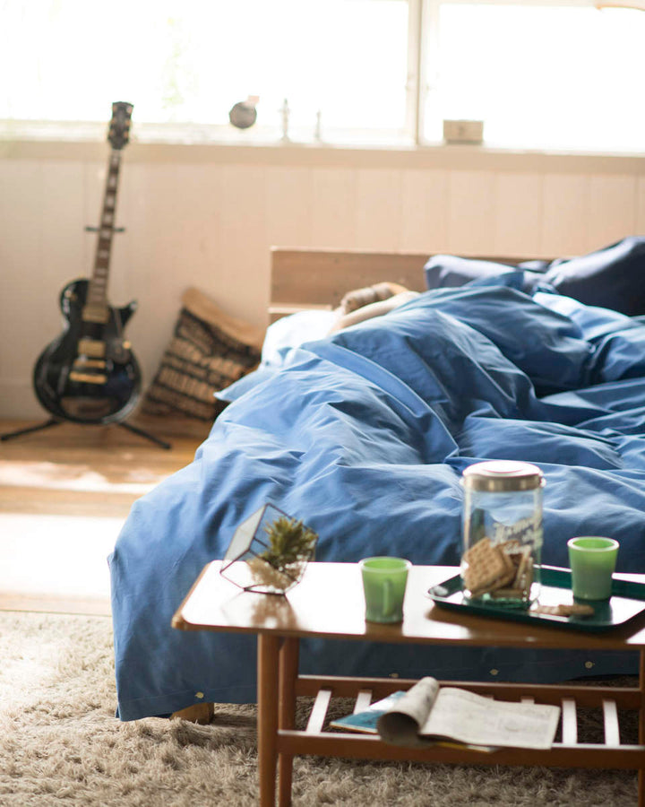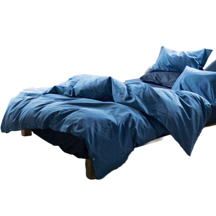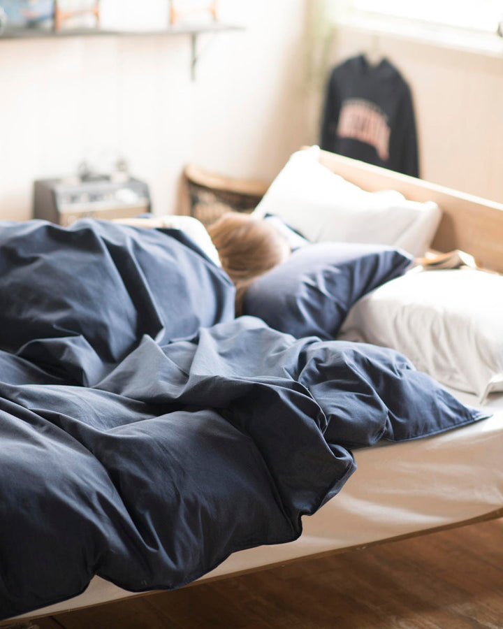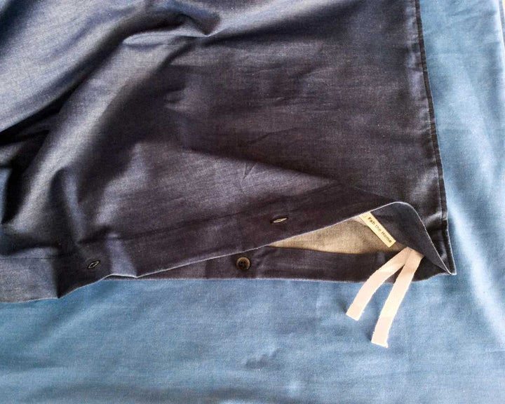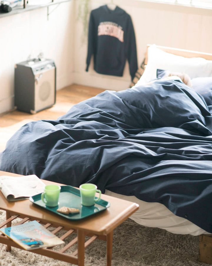 大きなサイズのベッドリネンは接ぎ目が入っていることが多いですが、Fab the Homeでは広い生地幅を生かし、肌に触れる部分に接ぎ目がない仕様に仕上げています。上品で落ち着いた色合いのネイビーと、カジュアルで明るい色合いのブルーの2色展開です。