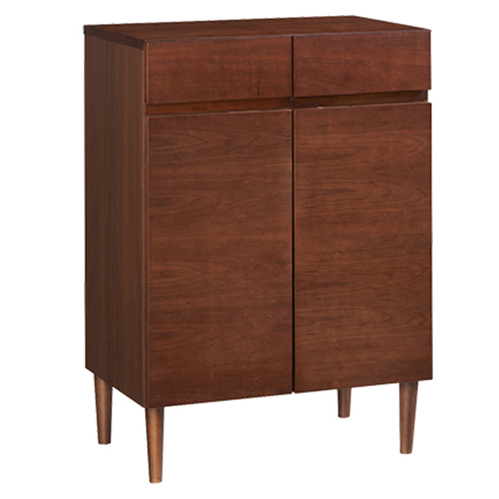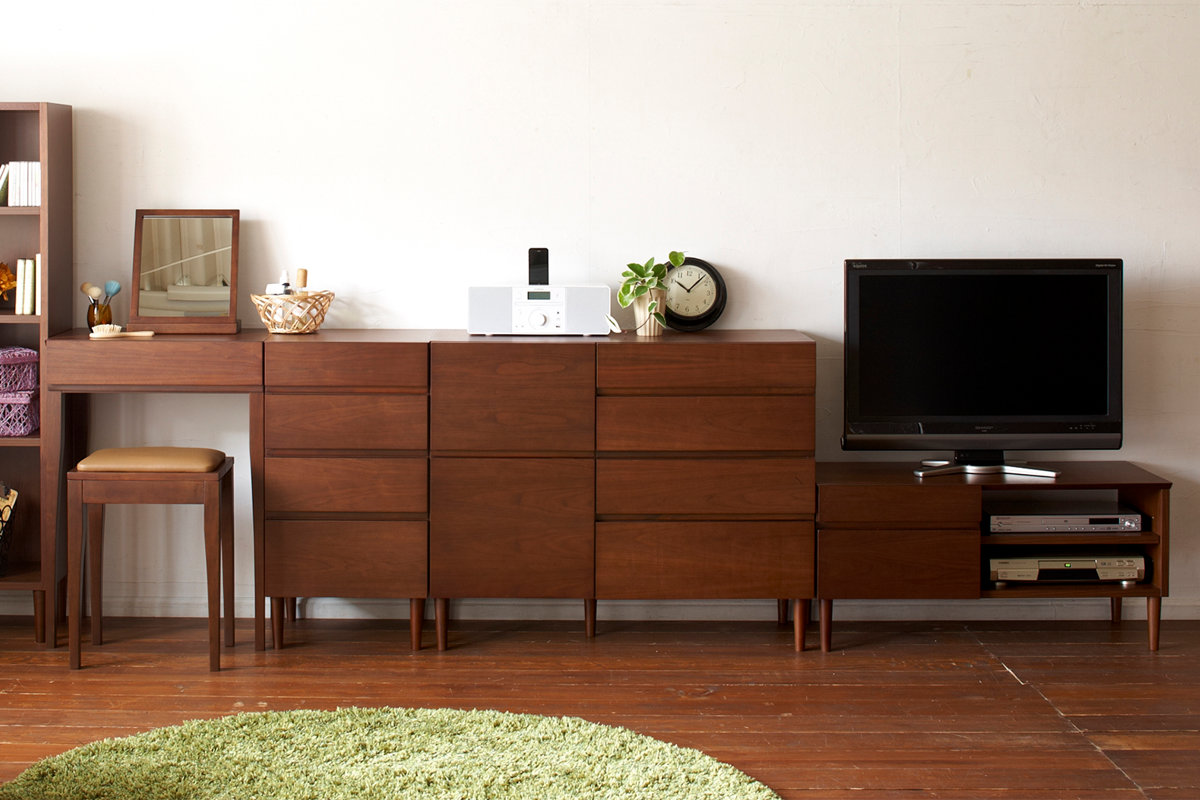 温もりのあるレトロな雰囲気にシャープでモダンなデザインが合わさったキャビネットです。上段は引出しが2杯、下段は両開き扉となっています。引出しはスライドレールなので、スムーズな開閉ができます。