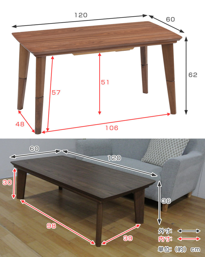 | サイズ | 約 幅120×奥行60×高さ62(cm) 高さ2段階調節可能:36/62(cm) |