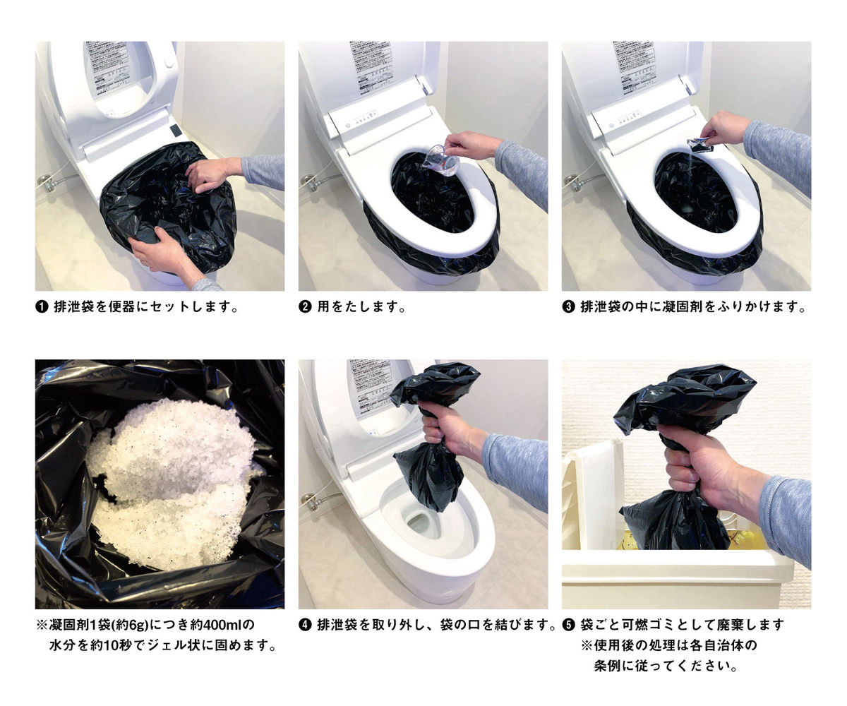 緊急時のトイレ処理、10回分がセットになっています。1人1日あたりの排泄回数が平均5回。災害時に水道が普及するまで、または避難所に仮設トイレが設置されるまで約1週間程度かかります。人数分×5回×7日分を目安に備えておけば安心です。