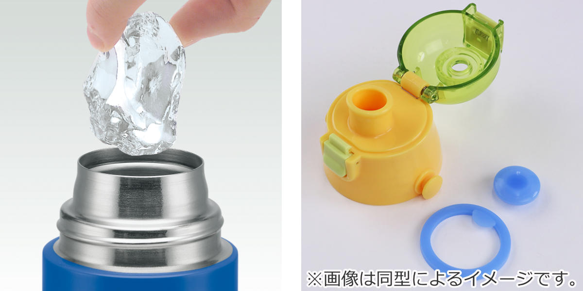 口径が広いので大きな氷も入れやすく、しっかり洗えて清潔に保てます。キャップユニットに付属しているパッキンは2つだけなので、お手入れ簡単です。