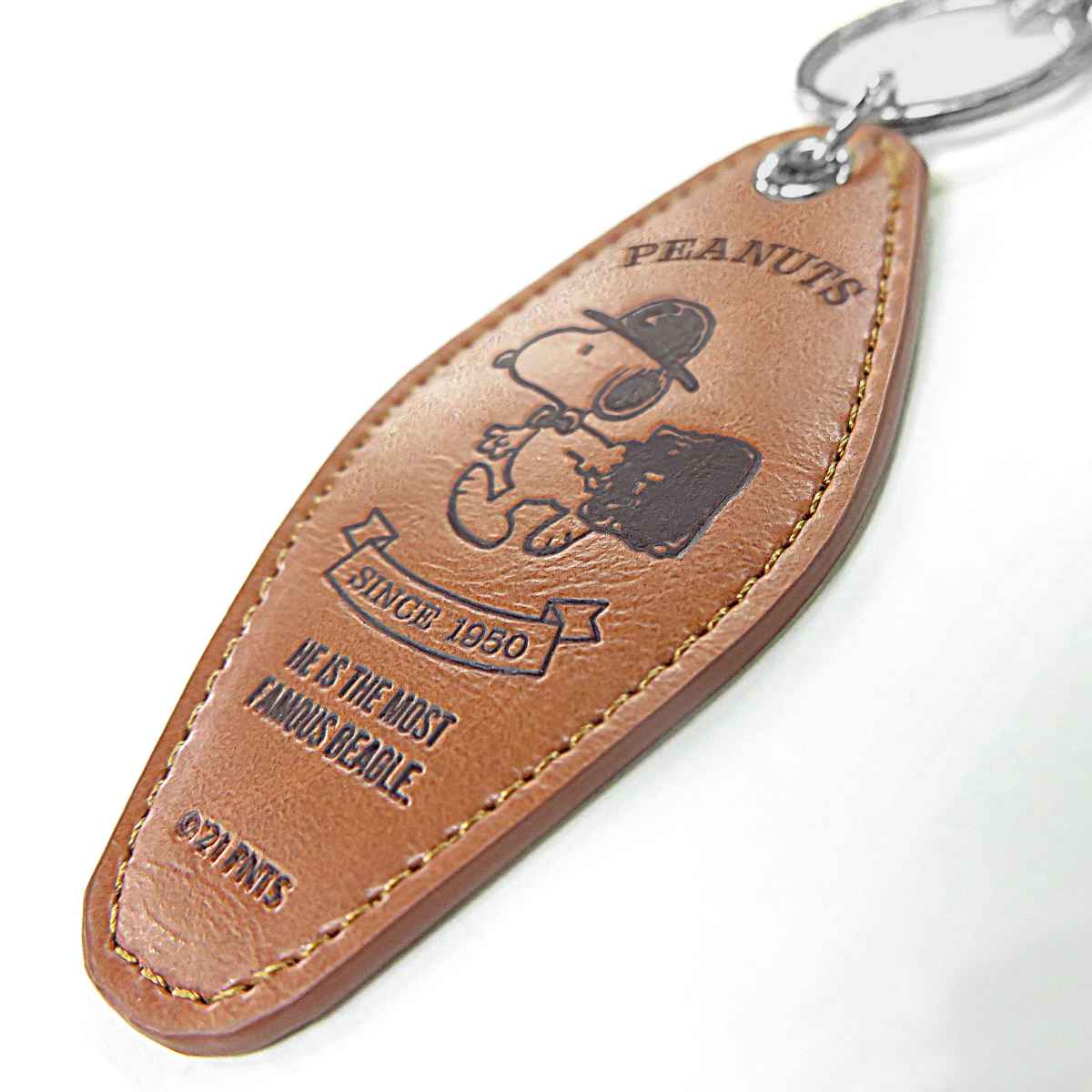 人気のスヌーピーが描かれたキーホルダーは、合皮に型押しの高級感のあるオシャレなデザインで、ちょっとした贈り物にもおススメです。