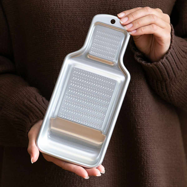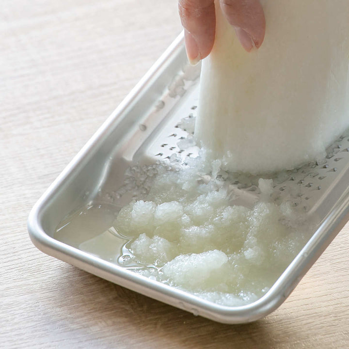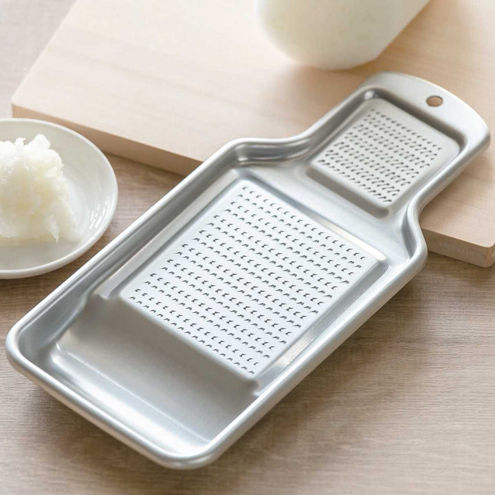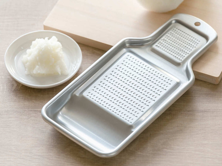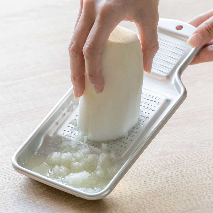 熟練の職人による独自の目立てが際立つアルミおろしです。サビに強く、耐食性に優れており、アルマイト加工がされているので、キズがつきにくくなっています。軽くて手に馴染みやすい昔懐かしいシンプルなデザインは、長くご愛用いただける和の逸品です。