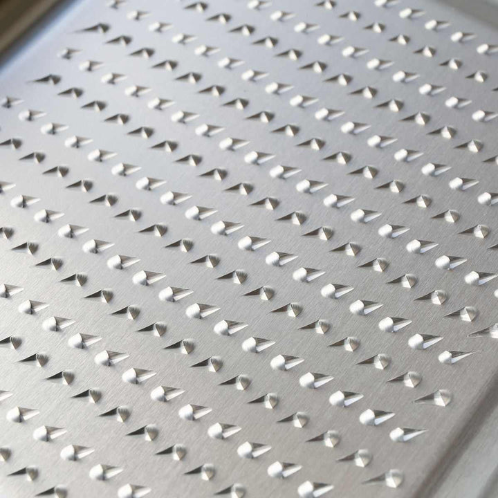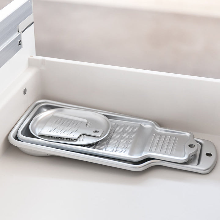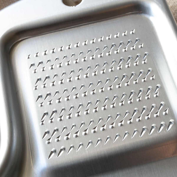 刃の形状の微妙な違いを施すことにより、刃が様々な面に当たり、向きを何度も変えることなく軽い力でスムーズにすりおろすことができます。粗目は大根おろしやりんご、細目はしょうがやわさびなどの薬味をおろすのに適しています。