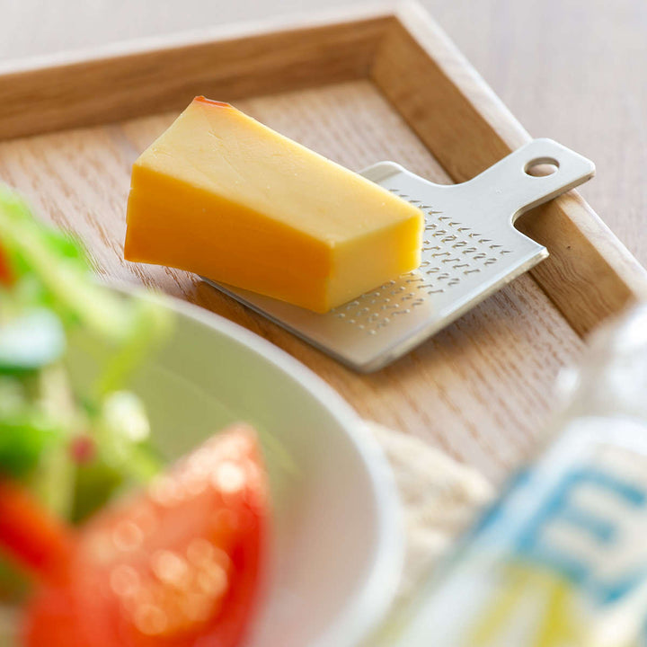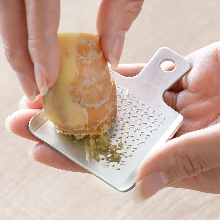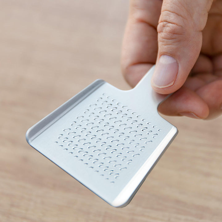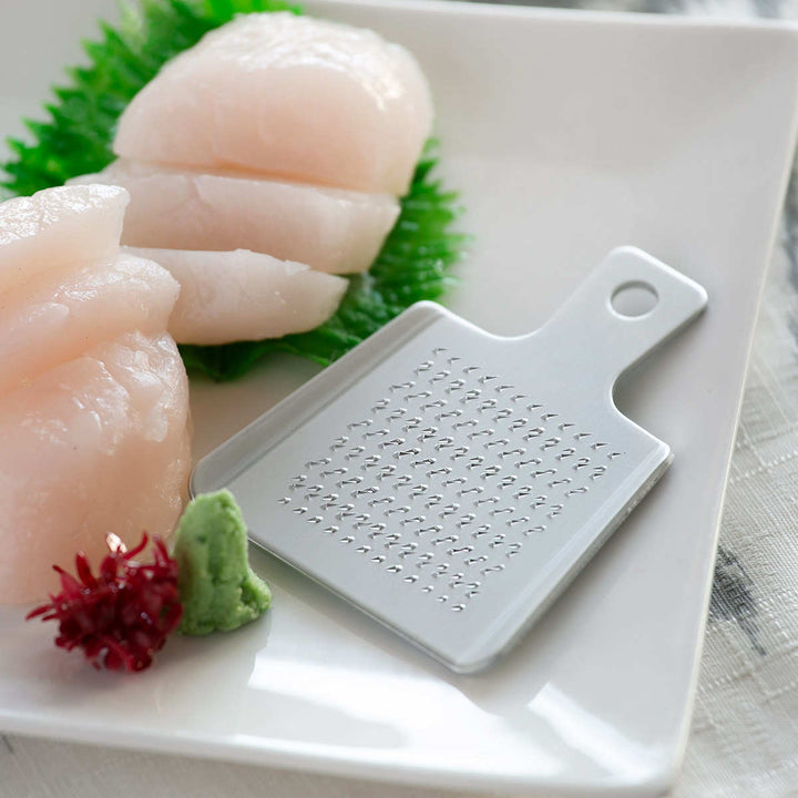 薬味おろしに最適なアルミおろしです。熟練の職人による独自の目立てが際立ち、サビに強く、耐食性に優れています。かわいいミニデザインがおしゃれな小さめサイズなので、ワサビやショウガ、チーズなどを卓上ですりおろし、新鮮なまま料理に添えることができます。