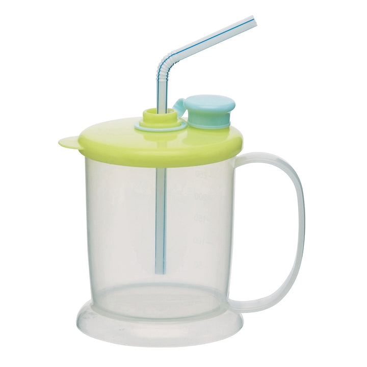 底部分が広くなっているので倒れにくく、安定して置くことができます。フタとストローを外せば電子レンジで加熱もOK。直径10mmのストローが使用でき、飲み物だけでなく、流動食を入れたりと便利にお使いいただけます。ご高齢・ご病気の方、握力の弱い方、手元が不安定な方に配慮した製品です。