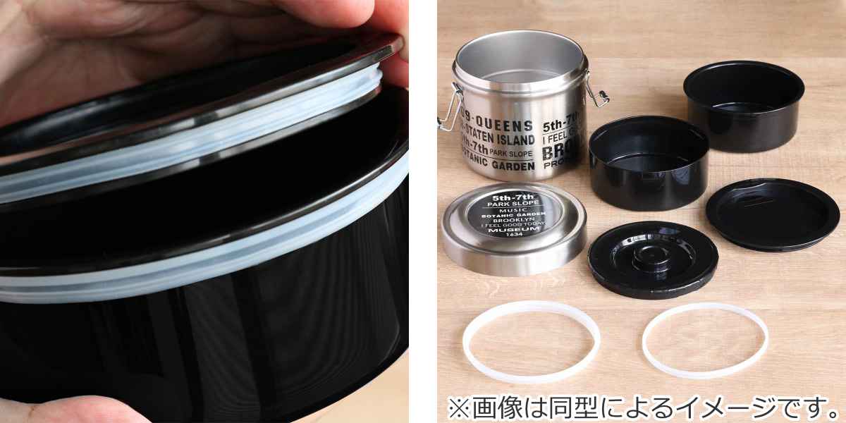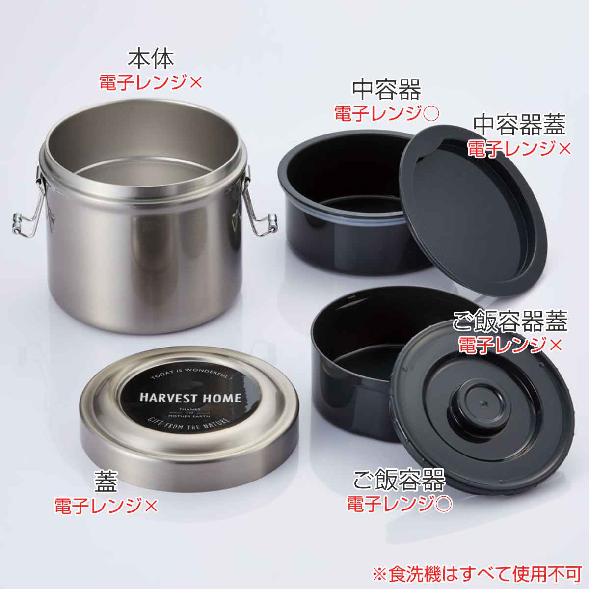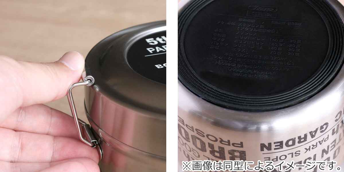 | 材質 | 本体・蓋:ステンレス鋼(アクリル樹脂塗装) 中容器・ごはん容器・中蓋:ポリプロピレン パッキン:シリコーン 底板:エラストマー 止具:ステンレス |