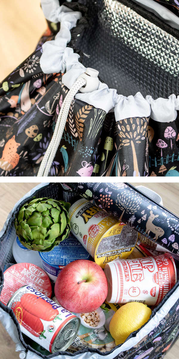 バッグの内側は全面アルミ蒸着シートを張った仕様で、バッグの口を紐で絞ると保冷効果があります。一緒に保冷剤を入れておくとバッグの中を低温に保ち、冷たさをキープします。バッグには底板が付いており、安定して荷物を入れることができます。取り外すことができ、汚れた時もお手入れが簡単に出来ます。
