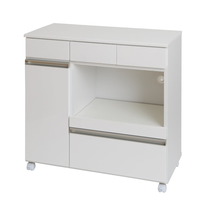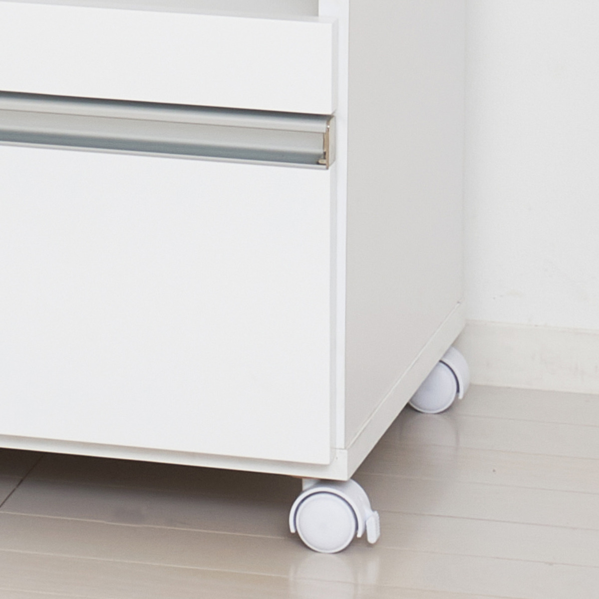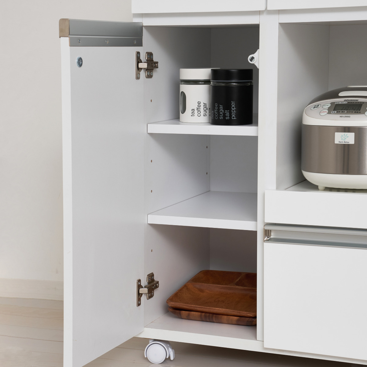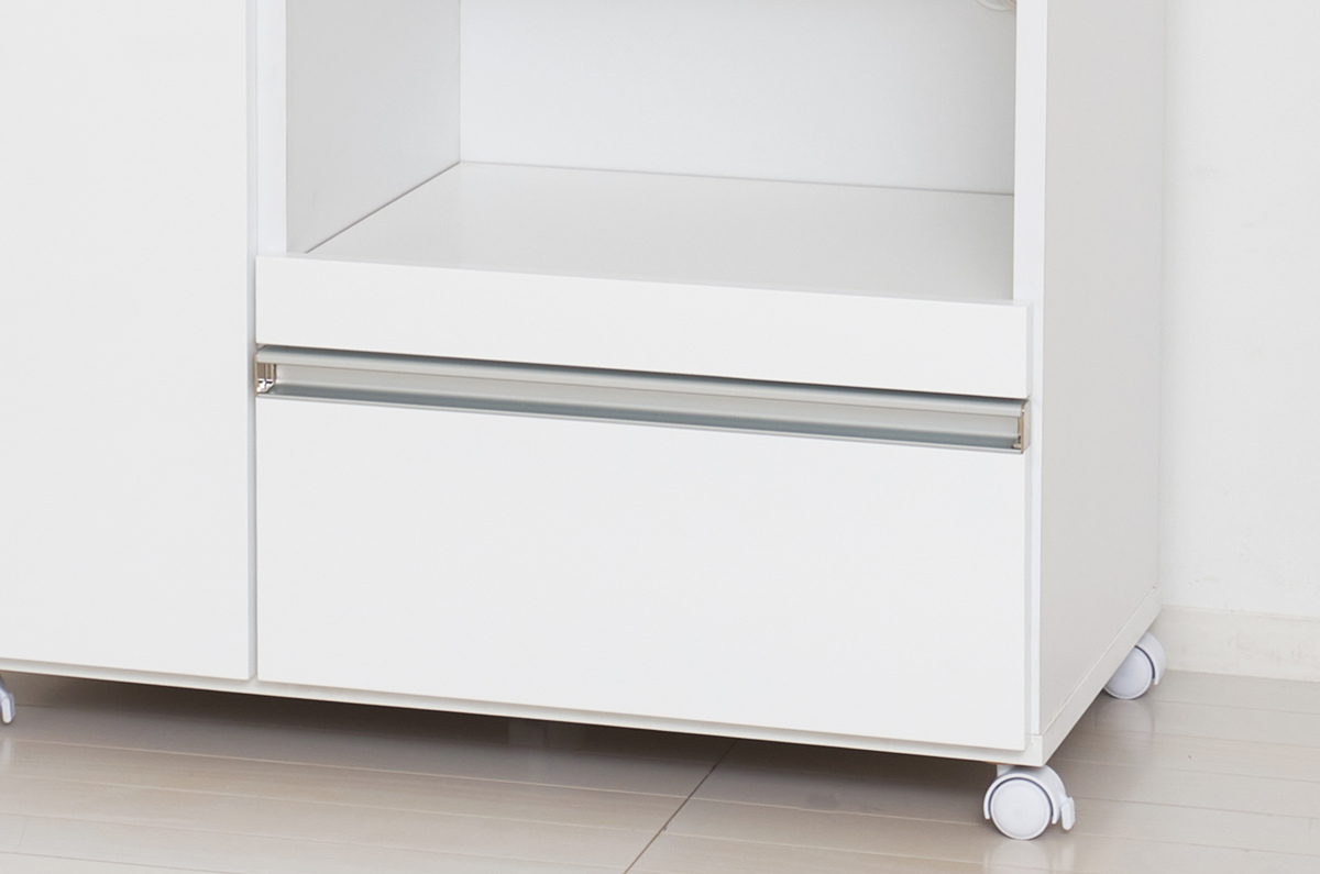清潔感のあるホワイトカラーでシンプルなデザインのレンジ台です。小物の整理に便利な引出しや食器を入れておける扉収納など、たっぷりの収納スペースが魅力。家電やキッチン用品をひとまとめにしておけるので、スペースの限られたキッチンでもすっきりと片付きます。