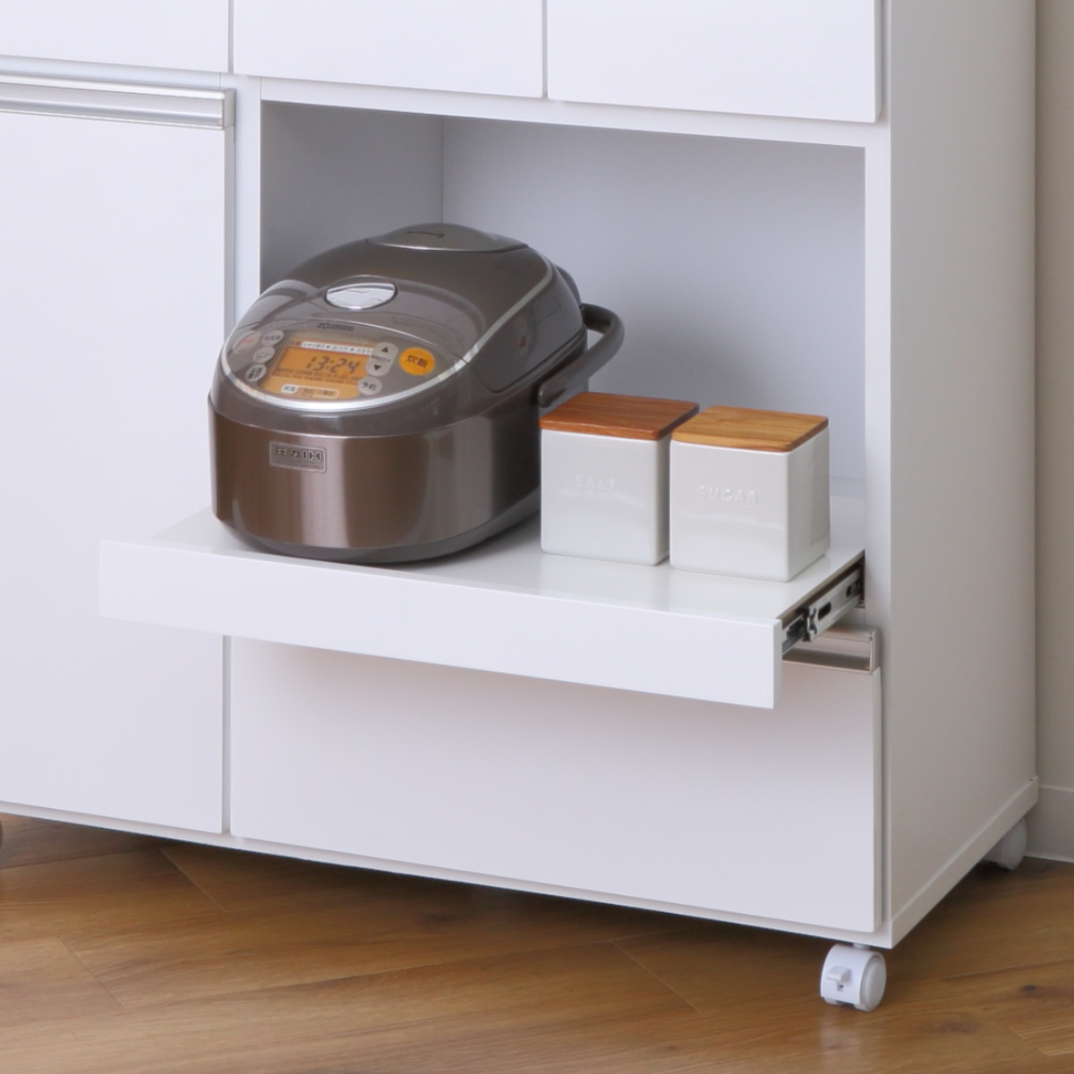 炊飯器やポットなど、蒸気の出る家電の収納に便利なスライド棚。手前までしっかりと引き出せるフルスライドレール仕様です。
